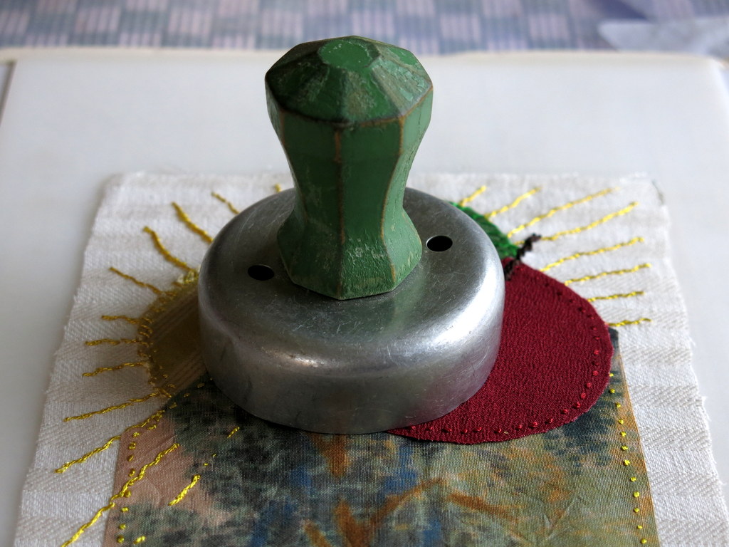 I have been working on a stitched book project since January. Working for 15 minutes a day, and for a total of five days per page, I will end up with a 20 page sewn book. All the fabrics and the sewing threads used in my book are scraps. I am using cooky cutter silhouettes on each page. On page thirteen, my lovely old biscuit cutter made…