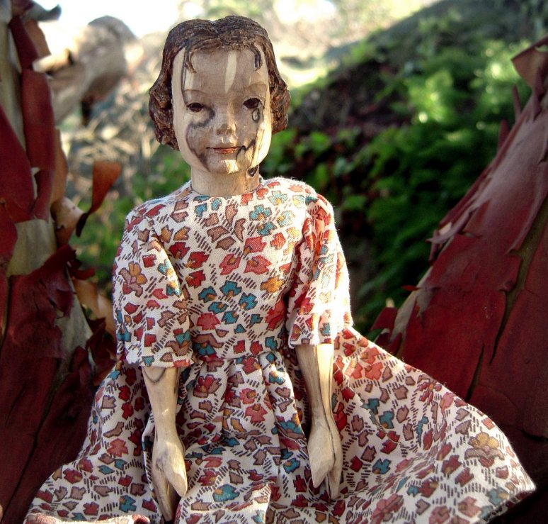Eugenia was carved by doll artist Gustavo Trullet who lives in Buenos Aires, Argentina. She is made of Arrayanes wood, from a tree that looks similar to the Arbutus or Madrona tree. She came to live with us in 2010, and I named her after the Arraynes tree, which used to be classified in the genus Eugenia. I asked Gustavo to carve her for me of this wood because I recall the Arrayanes tree from visits to Lago Nahuel Huapi in Argentina, and because Arbutus wood objects I see around here have a beautiful grain. Gustavo said it was a very difficult wood to carve, but I love the way she turned out. Gustavo called her Lihue while he was carving her for me, so I’ve kept it as part of her name. Eugenia’s right eye is naturally dark brown, and shaped by the streak of dark grain running across her face. I merely matched the colour for the left eye.
