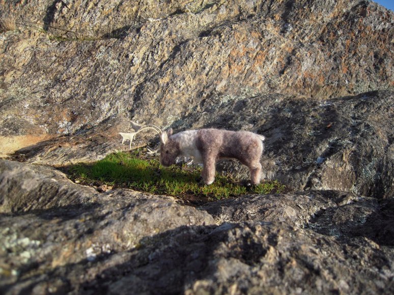 After several failed antlers, I ended up giving my pattern to a friend. He bent and welded some brass wire and fixed them to a tiny plate which I surgically implanted into the forehead. I used two-part epoxy putty to make them spatulate (so the reindeer can clear snow with them while searching for lichen) and painted them with acryllic. I had to rebalance the hind end too, the poor reindeer got a lot of mauling, and was glad to escape to the nearby park, where Constance and Tansy are hoping to find him and treat him to some fresh delicious lichen.