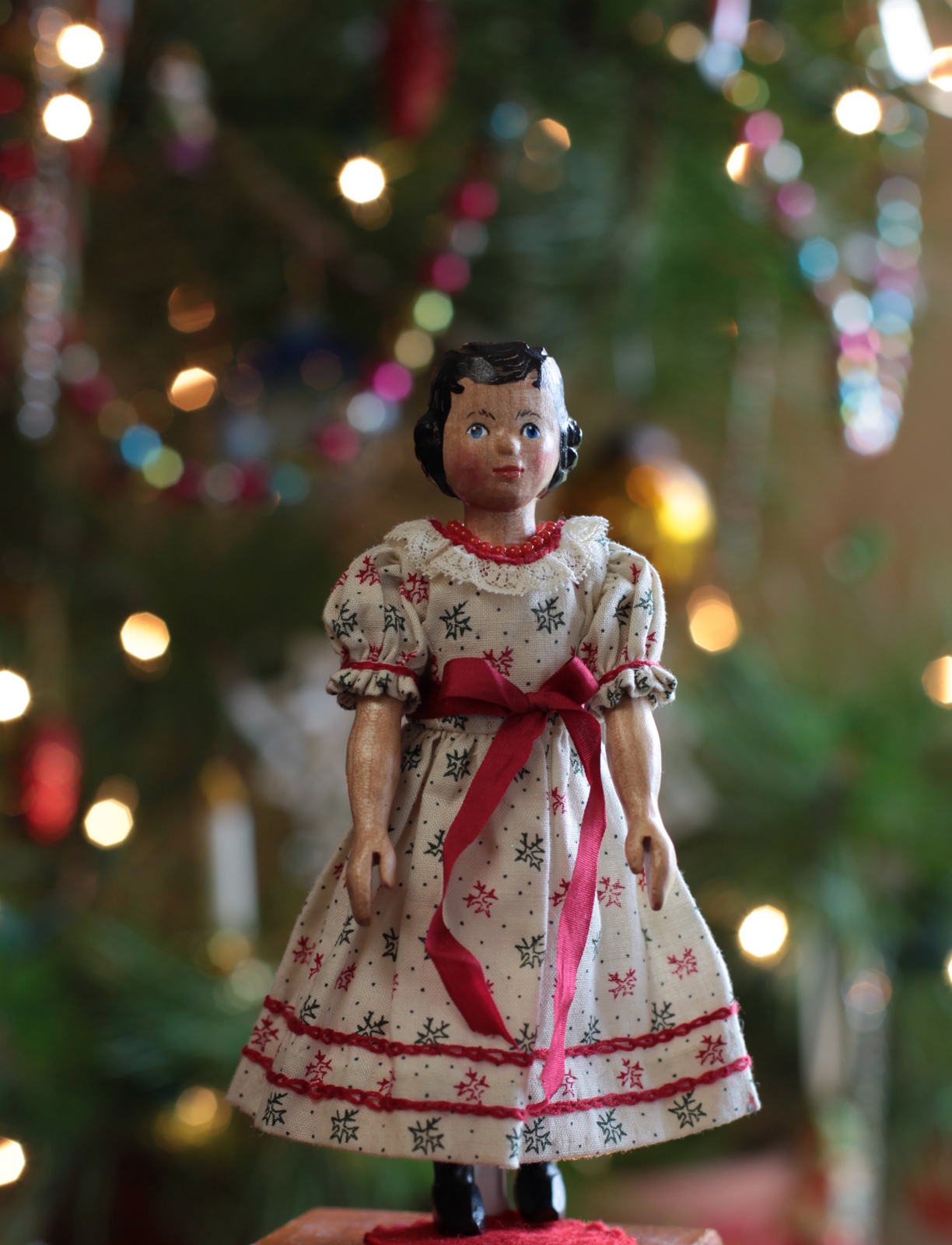 This is Christmas Rose basking in the glow of the Christmas tree. Rose was carved and clothed by doll artist Judy Brown and came to live with us on Christmas Day 2011.
