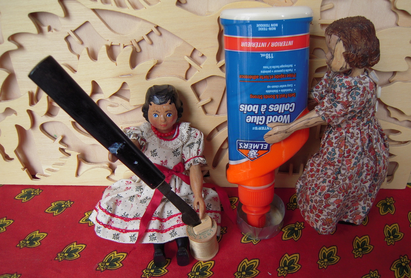 Very, very carefully, Rosie trims piece “B”, and Eugenia prepares the adhesive