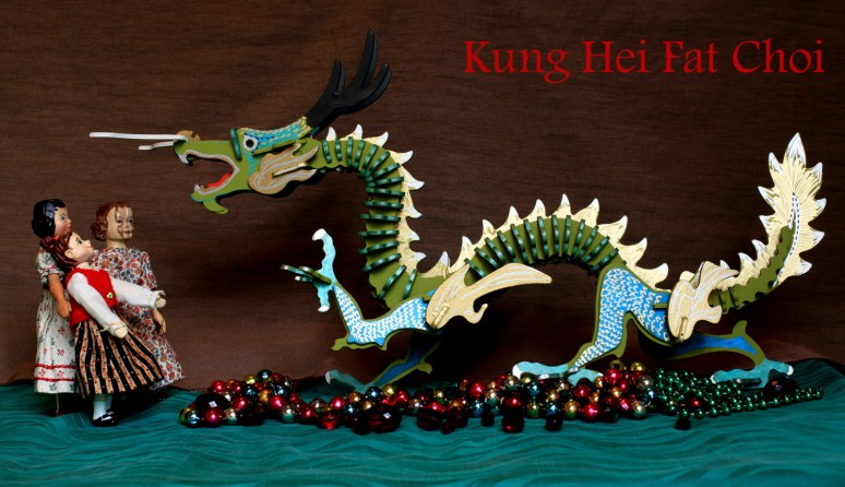 Chinese Dragons are watery creatures, so there is no danger of fire-breathing from this guy.  The little wooden friends are very relieved. Dragon, in Chinese, is pronounced “long”, and this is the end of the long story.