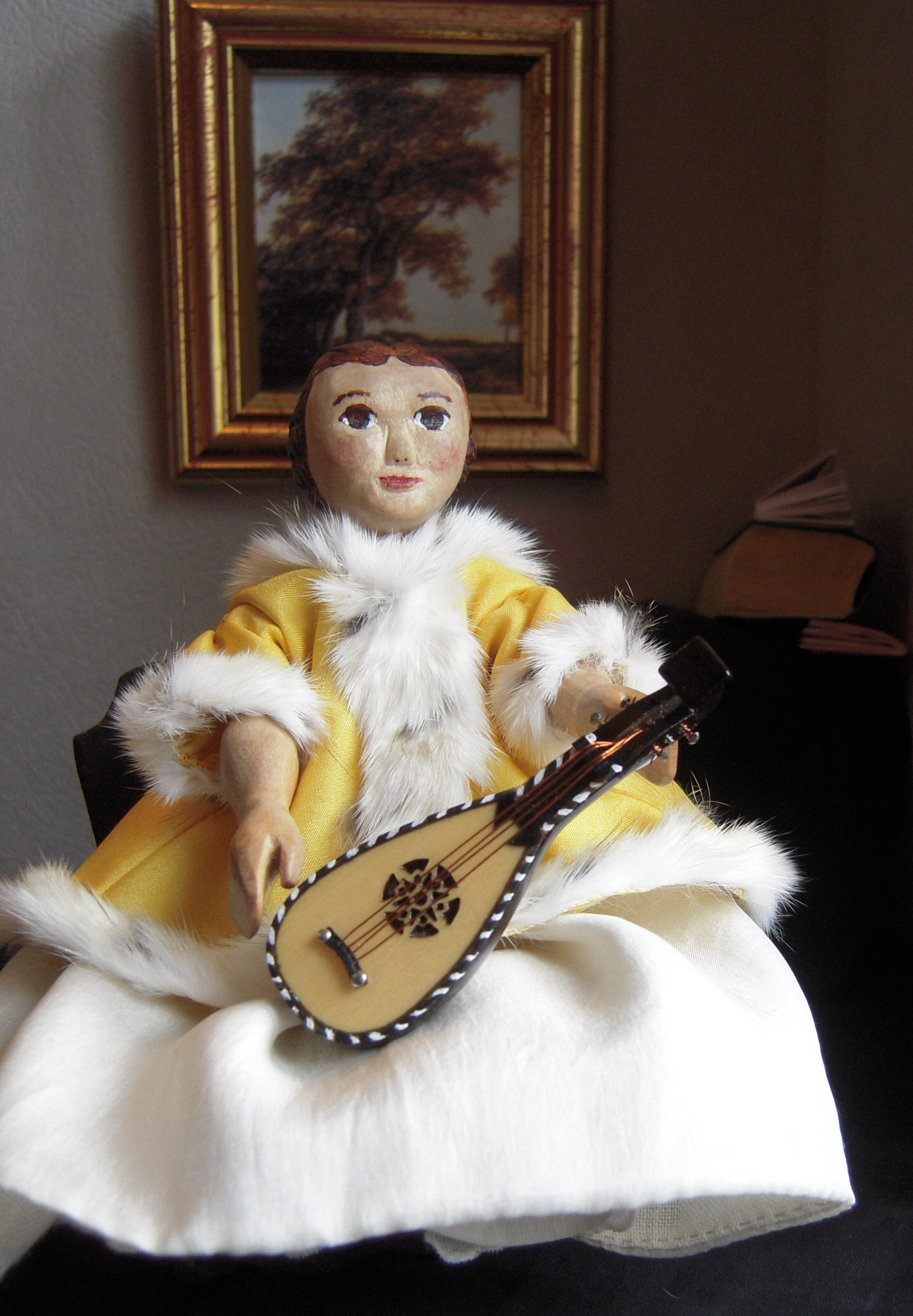 Constance recieved a tiny Lute from my son at Christmas in 2009.  The month of December on my mother’s Vermeer wall calendar that year, showed the  “Girl with a Guitar”. I took one look at the guitar in the picture and went off on a sewing jag that lasted for weeks.  The result was a 1670’s outfit for Constance based on the painting, and a photo session during which Constance found it no hardship at all to sit “perfectly still without moving so much as an eyelash”… her spirit was willing to learn to play the instrument but alas, her pegs were not.