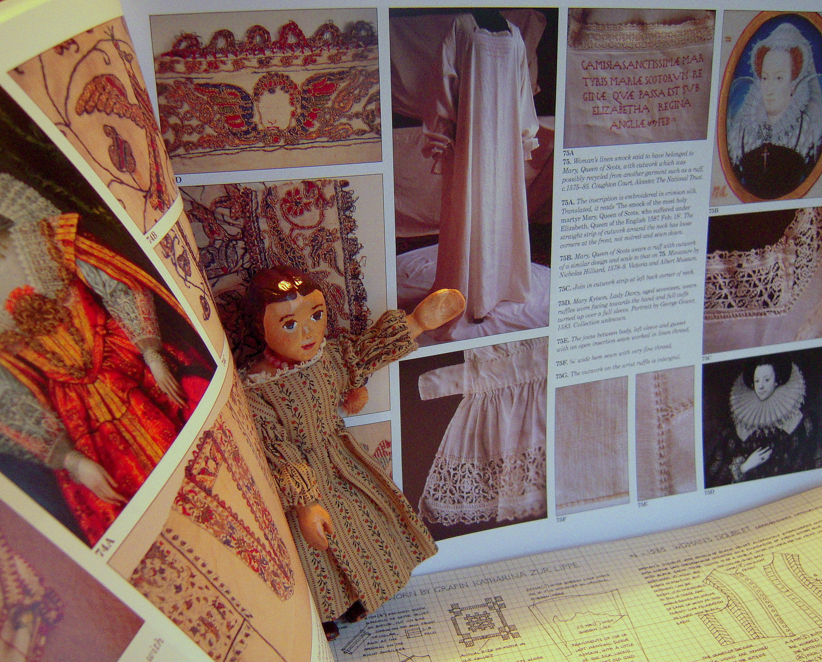 Janet Arnold’s books are a great resource for people who like to see every detail –   book #4  shows how to make smocks,  neck ruffs, farthingales, supportasses and pickadils. Constance is hoping I will start small – she has her eye on a linen “smock” said to have been worn by Mary Stuart herself….she  says, just the smock to start – Please?