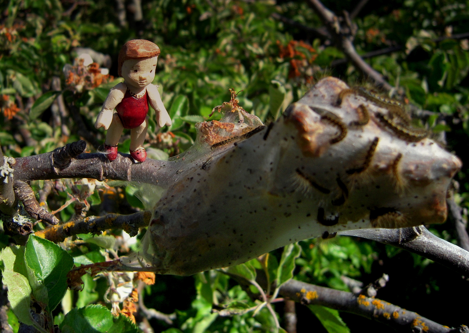The top of the tree has a nasty surprise. The tent caterpillars (Malacosoma sp. larvae) can defoliate a lot of the tree if left unchecked.