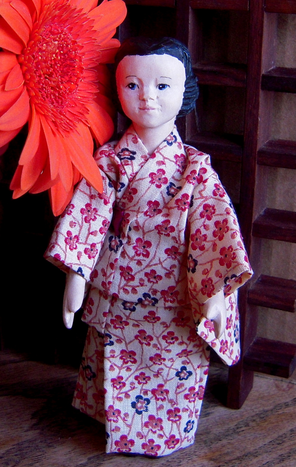 The following Gallery shows the process of Hitty Constance putting on the Kimono. It is not easy to dress a small doll completely authentically, and I took a couple of liberties, such as attaching the Obiage to the pillow inside the Obi Knot, and also pinning the obi in place while I got the Obihimo tied properly. I am not an expert…but Kumiko thought the result looked correct. There are many styles of tying the Obi knot. In this instance I copied the Obi from a doll given to me by a Japanese lady. Kumiko says that style of Obi is worn by Classical Japanese dancers performing the Nihon Buyo dance, or by apprentice Geisha (Maiko).
