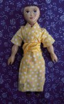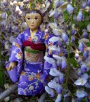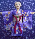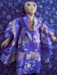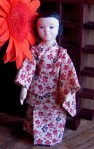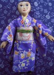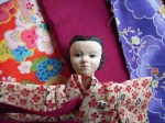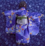 To help me get it right Kumiko made a little Kimono for Patience, so I could see the places where I needed to alter the purple one. Patience likes this Kimono because it is a pretty fabric, and very comfortable. The ties are attached to the Kimono, the right one passes through the gap in the sleeve and both of them meet at the back and are tied in a bow…This is acceptable for a child’s Kimono.