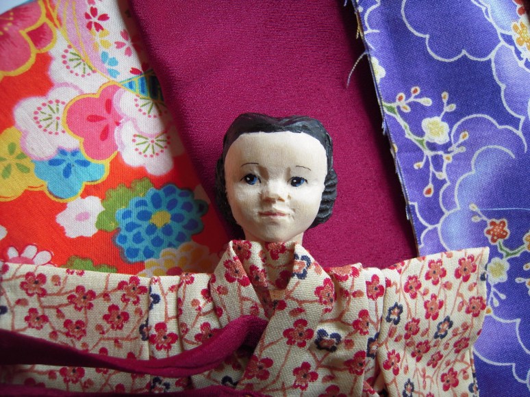 Patience has a very good friend in Japan. Kumiko approved of the Kimono I made last month, but had some suggestions on how to make it more authentic. She said she herself wanted to see Patience dressed in a Kimono properly. She sent me some fabrics to make even more Kimonos for the Quimper Hittys. I haven’t started that project yet as I wanted to get the purple one just right first before I started on the silk ones!