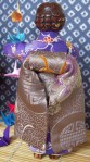 The goal is to have a cylindrical shape, and fortunately Constance is that shape naturally, so she will get dressed in the purple Kimono….first she puts on the yellow under Kimono. This is not a completely authentic shape, but it is better than going without undergarments.