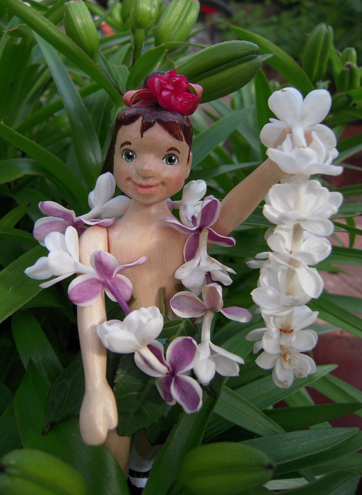 It was fun looking for tiny flowers. Min’s are made from two kinds of Lilac, Constance has Valerian, and Monkey Flax and a white flower I think was a Hebe. Rose has Forget-me-nots. I just strung them on a thread with a thin needle.