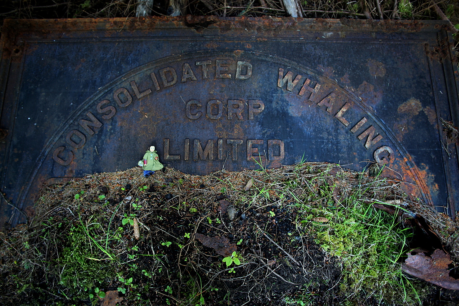Try-Pots were used to render Whale-oil. This one is rusting away on the beach.Tansy is faintly appalled, but remembers her Ancestor in the story “Hitty – her first hundred years”. That original Hitty had much more up close and personal encounters with whale rendering.