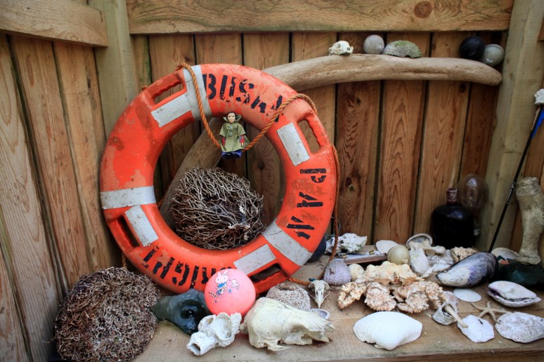 Who would have imagined the most interesting collection was in the outhouse? Bones, dried kelp holdfasts, glass float fragments, a crab exoskeleton, seashells, and other altogether eclectic flotsam.