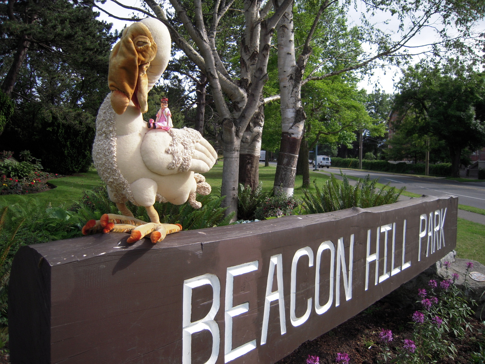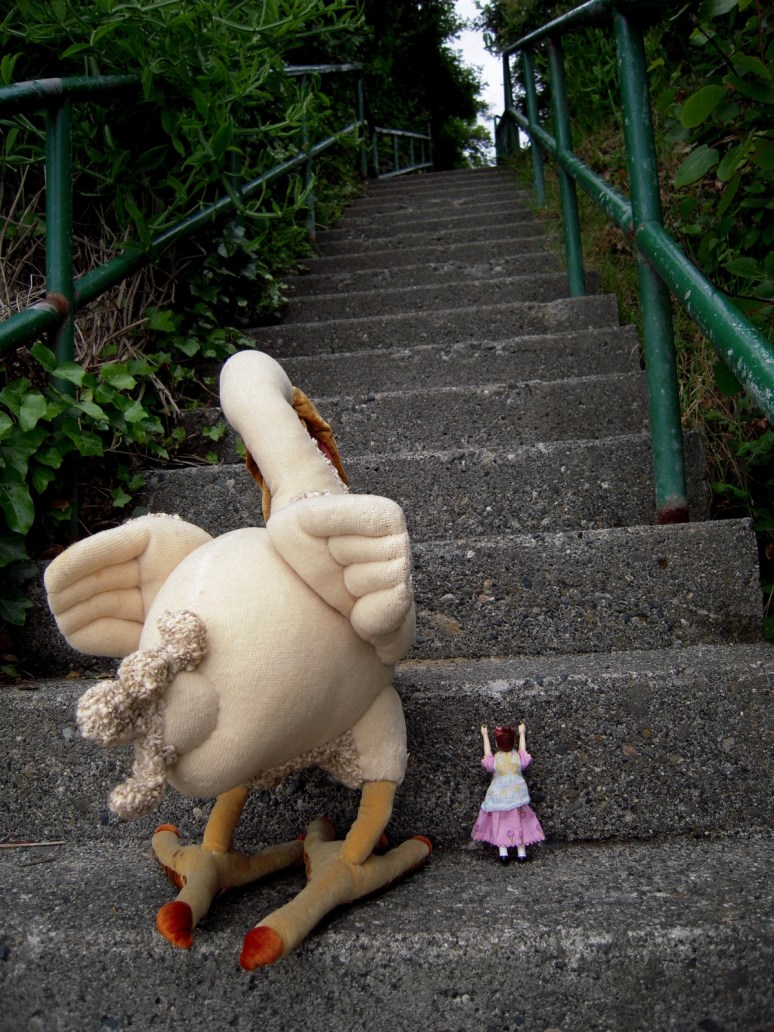 Min and Raphus start their long hike to the Quimper Hitty’s home. The peacocks in the park make a point of haughtily avoiding their clumsy, monochromatic, feeble-tailed, distant cousin.