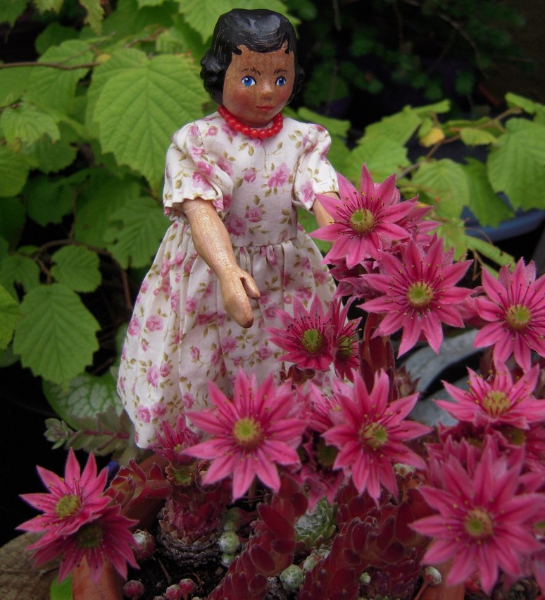 Rose is admiring the little flower pot full of Hens-and-Chicks…the flowers are always so surprising – flat little leaf clusters suddenly produce tall stalks with pretty pink flowers on top!
