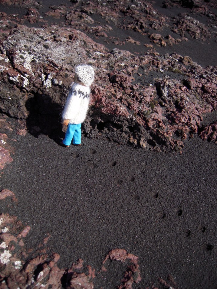 On the second day of the trek, Constance stopped to admire the black sand and red lava by the edge of the Skafta River.
