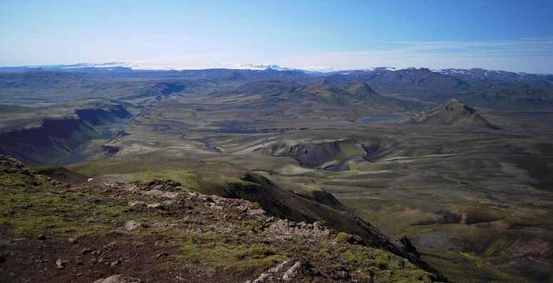 From the top of Gjátindur,  because it was a super clear day, we could see seven glaciers. In this picture you see Mýrdalsjökul at the centre left horizon, and behind it Eyjafjallajökull.  In the middle distance, and below us on the left is the spectacular dry chasm of Eldgjá.  In the middle distance on the right is the gorgeous blue river that tumbles over the edge of the chasm into the double waterfall of Ófærufoss.