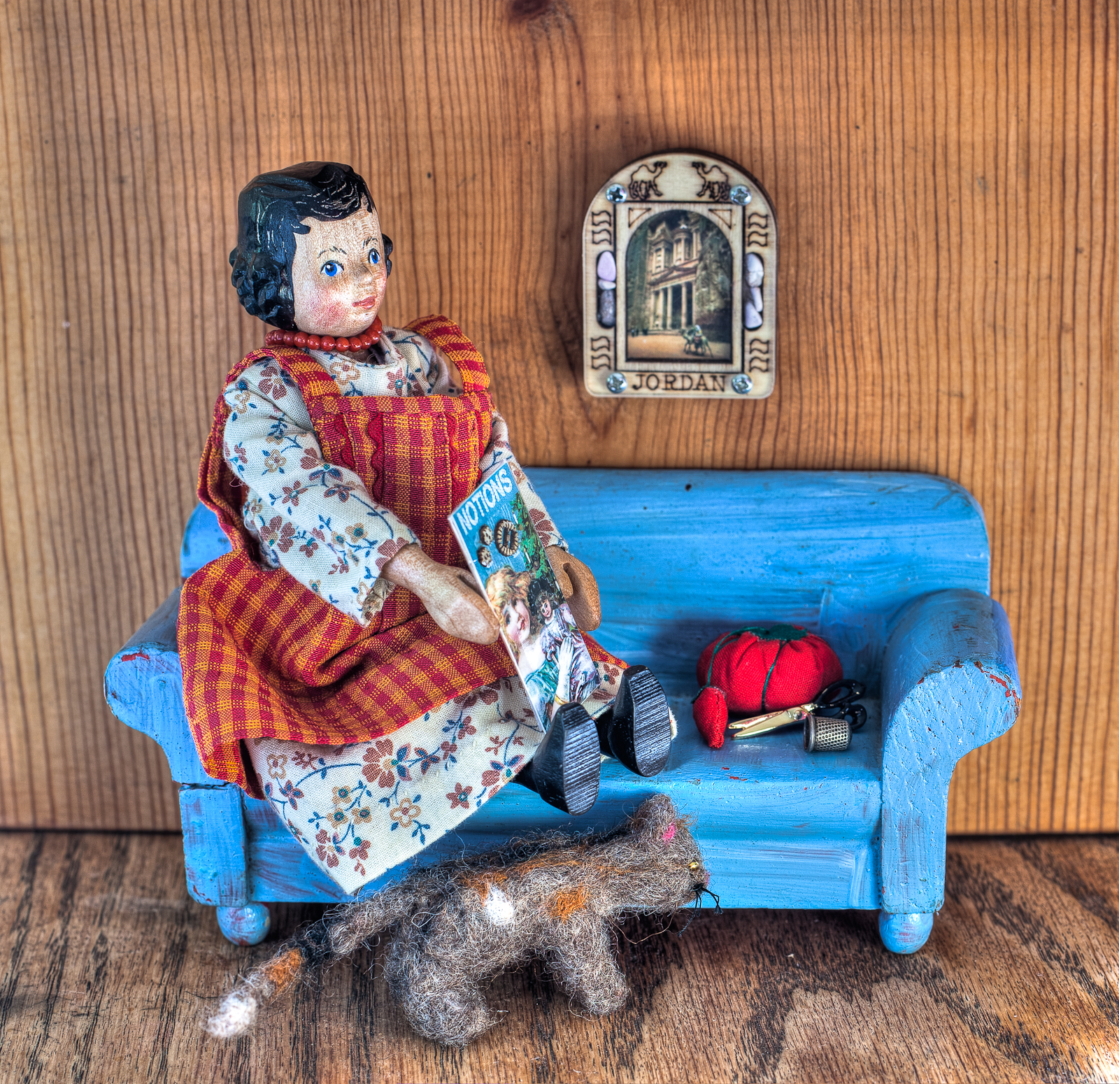 Some friends have recently given the Quimper Hittys some lovely presents! Rose is holding a card of tiny buttons which was made by Ilisha Helfman, and given to us by a prize-winning member of the (US) National Button Society.  A friend gave us the tiny perfect thimble lying on the couch…I never imagined there were actual Hitty-sized thimbles in the world, now as soon as we can find a small needle, Rose is ready to sew and she won’t prick her finger.  One of our friends was recently in Jordan and brought back  tiny shadow box with a sketch of Petra and some tiny Jordanian rocks.