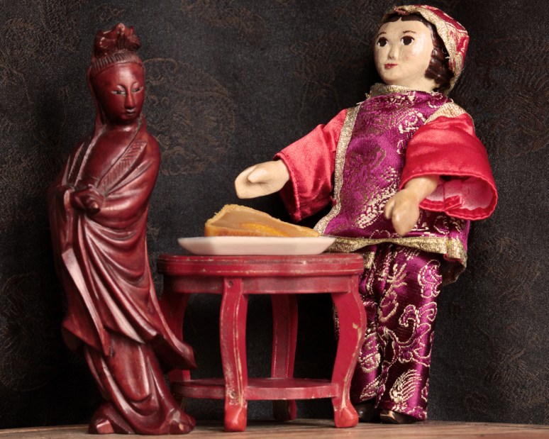 Tonight is the Autumn Moon, and the Quimper Hittys have acquired a piece of Moon Cake. Normally Chang’e the Moon Goddess is invited to bless the moon cake. Our Guanyin figure declines to get involved, even as a stand-in, as she/he does not want to step on anyone’s toes. We all wish everyone a happy Autumn Moon.