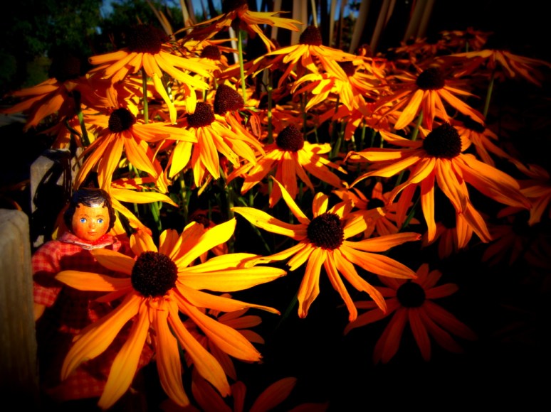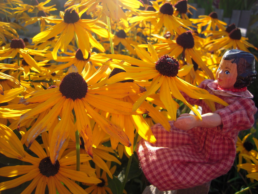 Lovely. I remember watching the Black-eyes Susans follow the sun every year a a kid. Some of them were so much taller than I was. Wonderful images. Rose looks lovely amongst them.