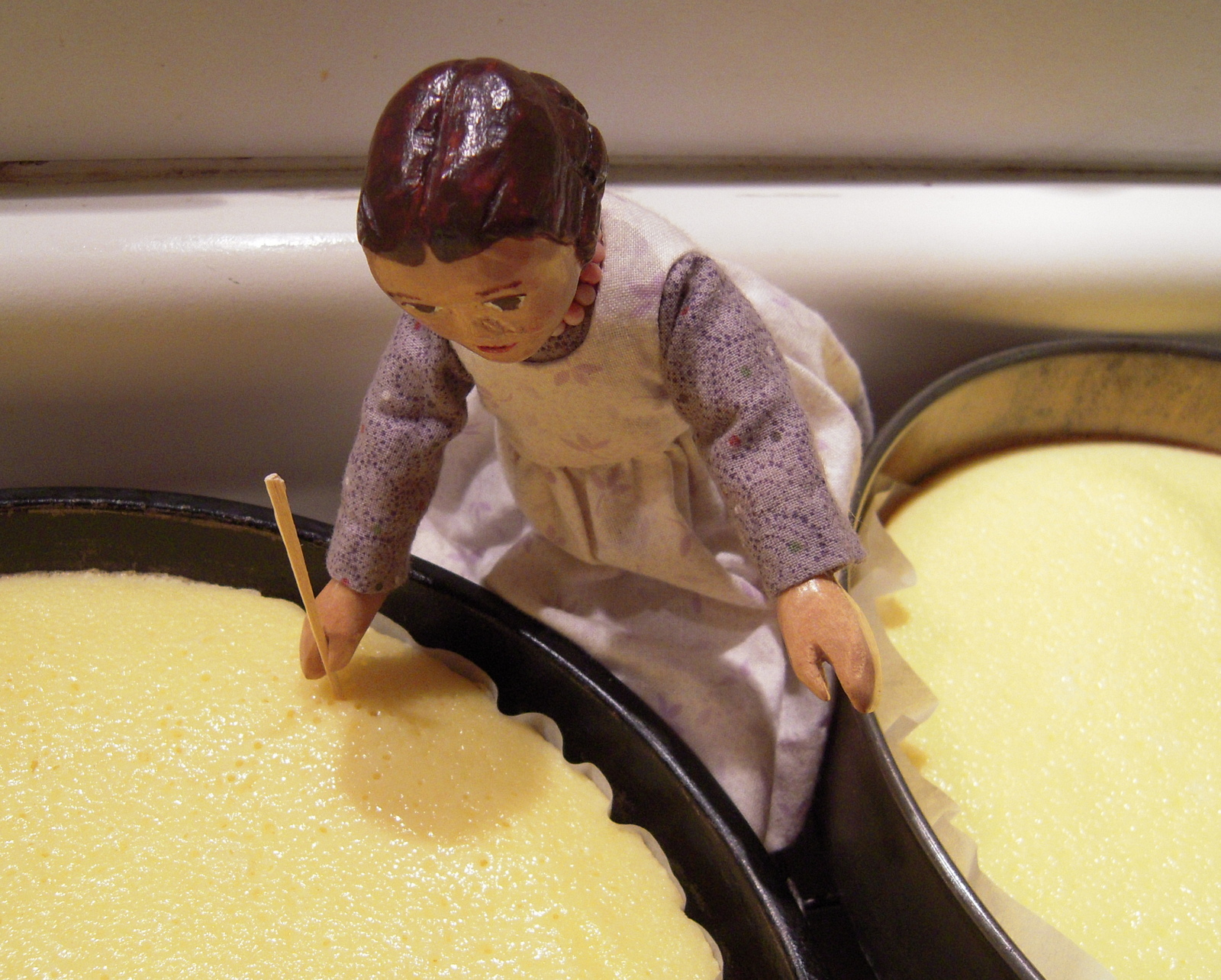 Constance has donned her apron and is helping in the kitchen again.  We have always wanted to try this recipe, and a perfect opportunity is coming up…it is a complicated cake so we are starting today by: Beating three eggs and one cup of sugar in a large bowl. Next,  mixing 1 1/3 cups cake flour, 2 tsp baking powder in a small bowl, and adding it and 1/4 cup milk to the egg mixture. Then stirring in 2 tablespoons melted butter, 2 tablespoons lemon juice and 1 tablespoon grated lemon rind.  The batter is poured into two 9-inch cake pans and baked for about 12 – 15 minutes at 350 degrees f.
