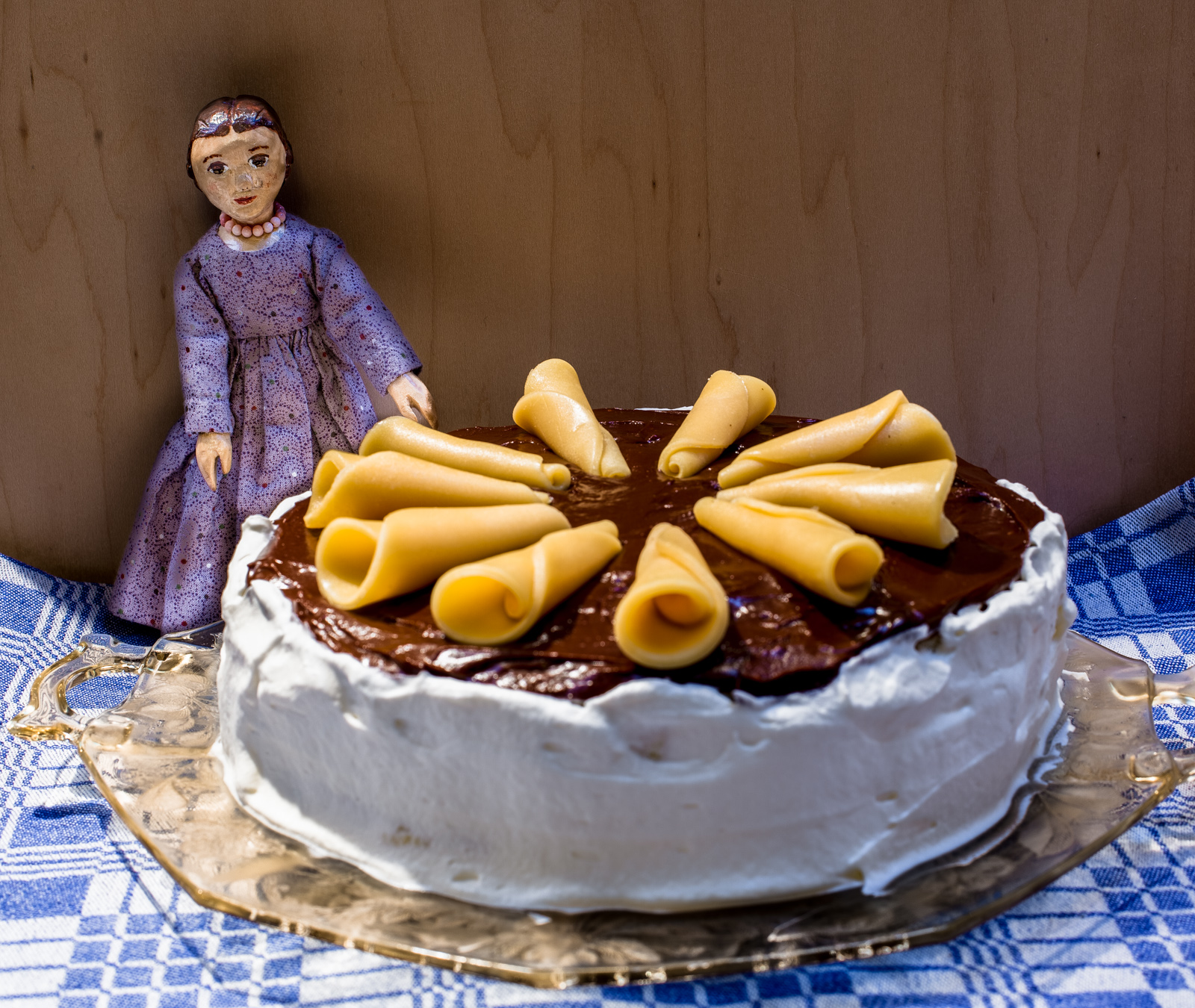 Last two layers of the cake: chocolate icing made by melting 4 oz semi-sweet chocolate and two tablespoons unsalted butter in the top of a double boiler, stirring in 3/4 cup icing sugar, 1 tablespoon rum and 2 tablespoons strong good coffee…this is spread on the top, and the marzipan cornets are arranged in a circle on the top.  Last thing is a layer of whipped cream around the sides. Pop the cake into the fridge to chill a while.