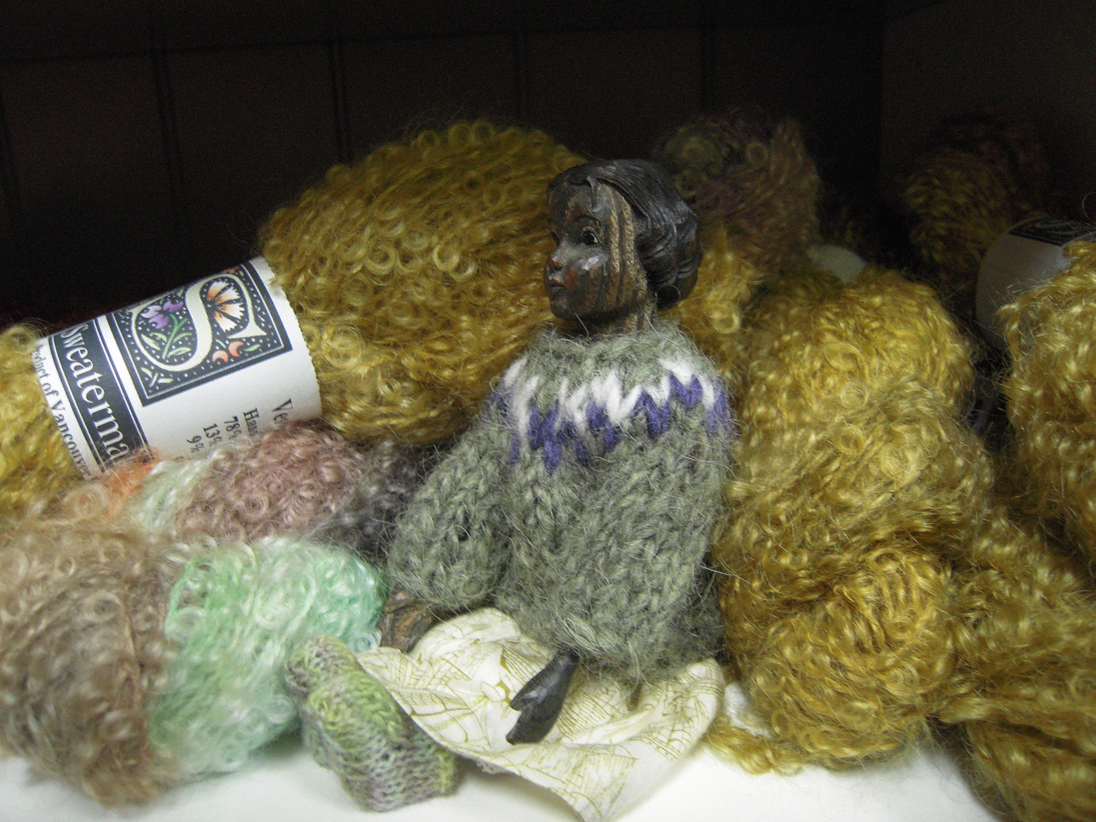 Some of the Quimper Hittys went to their favourite fibre store. Knotty By Nature is a nice cosy place to spend a stormy November afternoon. KBN specialises in natural fibres, and offers classes in all kinds of fibre work. Today there was a class called “Meet the Gentle Wheel”. The Quimper Hittys try not to cause distractions and go exploring in other parts of the store. Perdita finds some mohair Bouclé to snuggle up to.