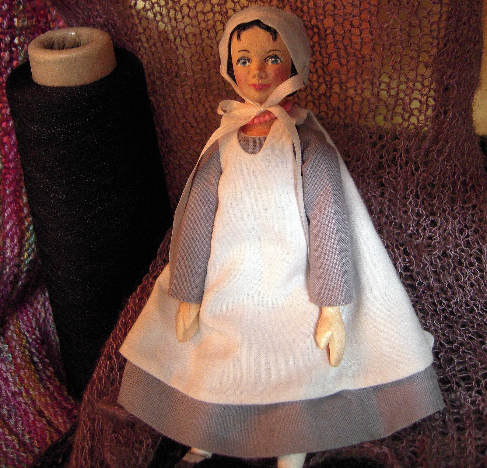 My Swedish Great-Aunt taught me to knit human-sized hand-knitted socks and mittens, the Quimper Hittys think of them as Hitty sleeping bags.