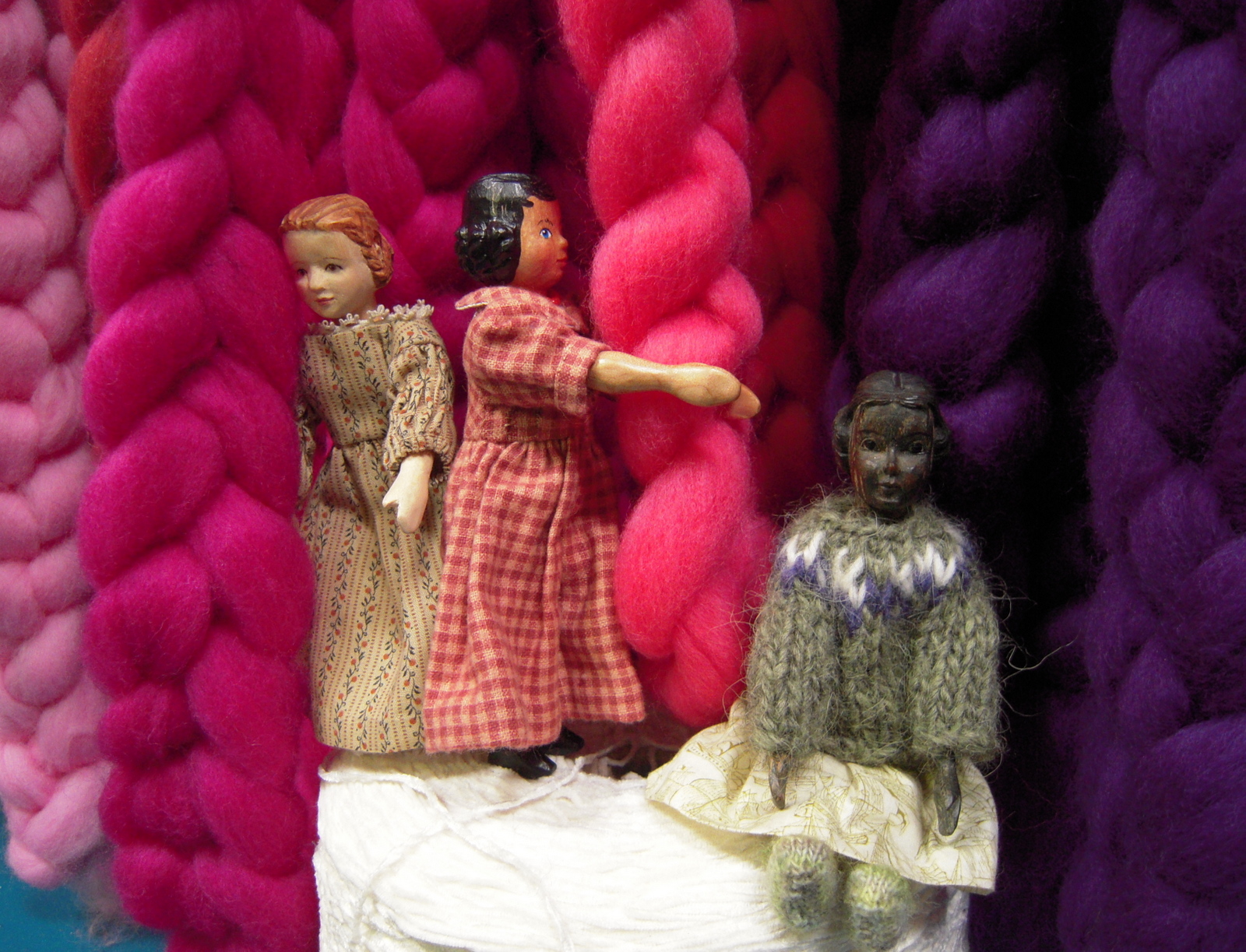 Three of the girls fondle the colourful corriedale roving.