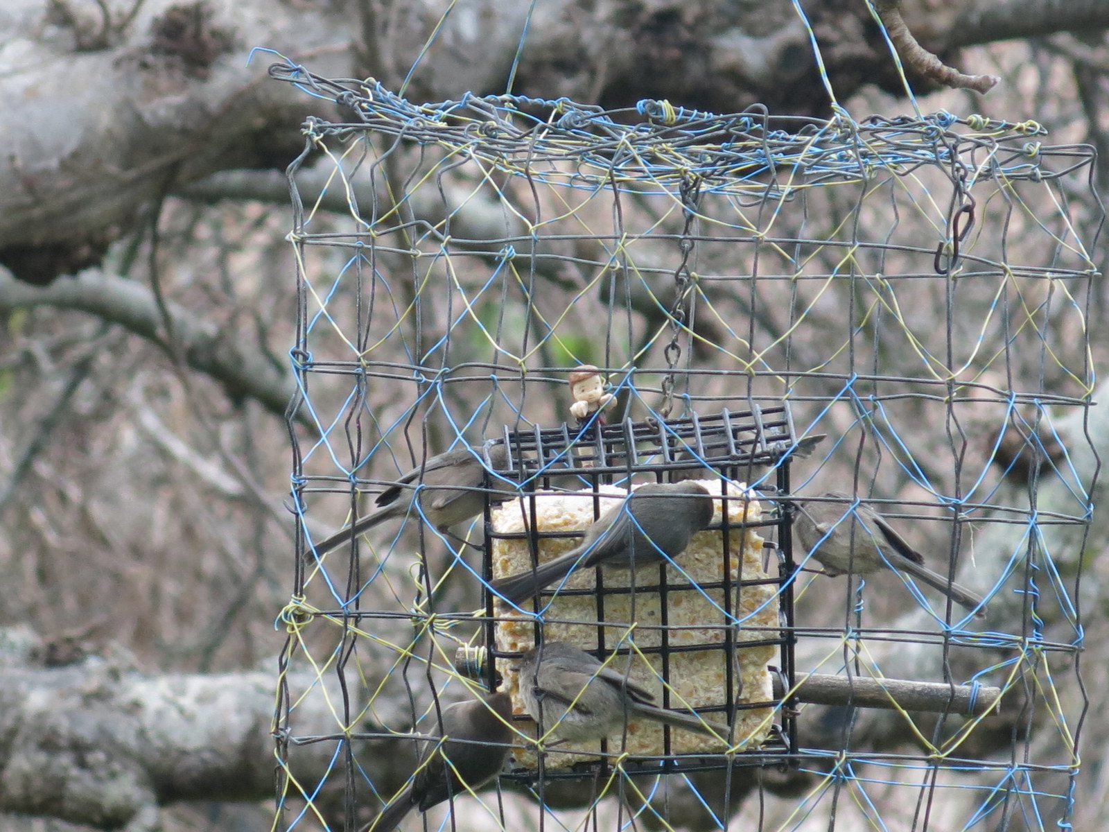 We’ve also seen Juncos, sparrows of various kinds, Nuthatches, and the occasional Downy Woodpecker…the suet block is inside a second cage to protect it from being gobbled by starlings, crows, flickers and squirrels.