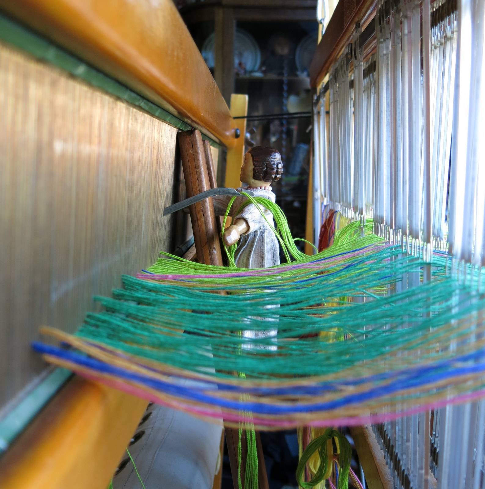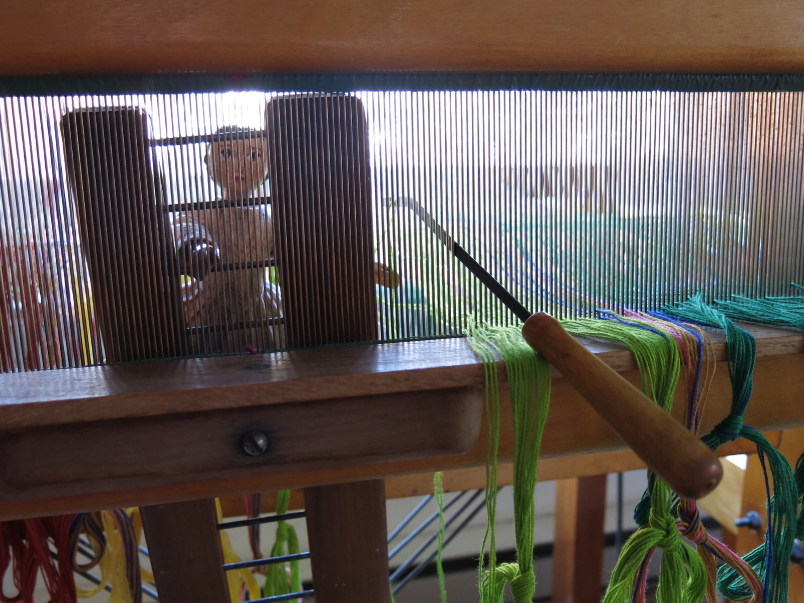 This is what it looks like from above… Constance climbs up the raddle (a perfect Hitty ladder) and here she is looping two warps over the reed hook. Constance enjoys the work and it IS work!!