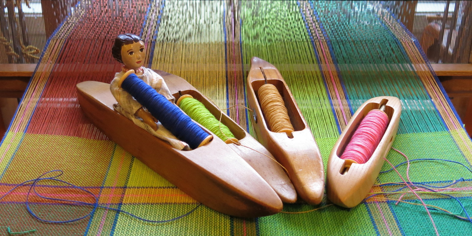 The prepared bobbins will be inserted into a boat shuttle like the one resting on the front beam at the top of this picture.