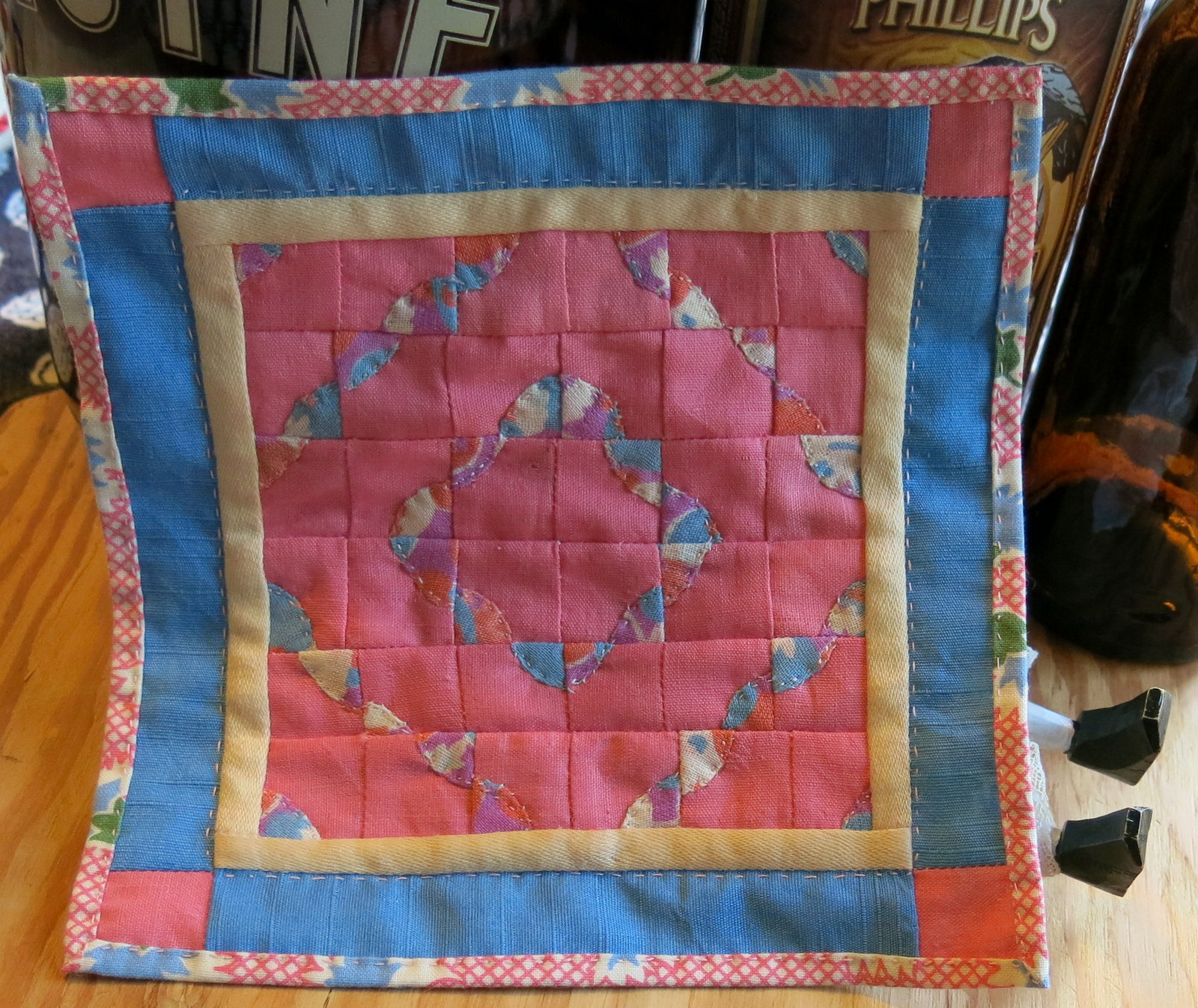 One of the Hittys is taking an innocent nap under this pretty quilt.  Too bad about its’ suggestive name…This pattern is supposed to be pieced, but I couldn’t fathom sewing all the little curves, so I applied a 1 1/2 inch circle to a 2 inch square and then cut the square into quarters.  Re-stitching the little squares into this pattern was maybe not so accurate but at least I didn’t have to fiddle with thirty-six one-inch square blocks with annoying curved seams.