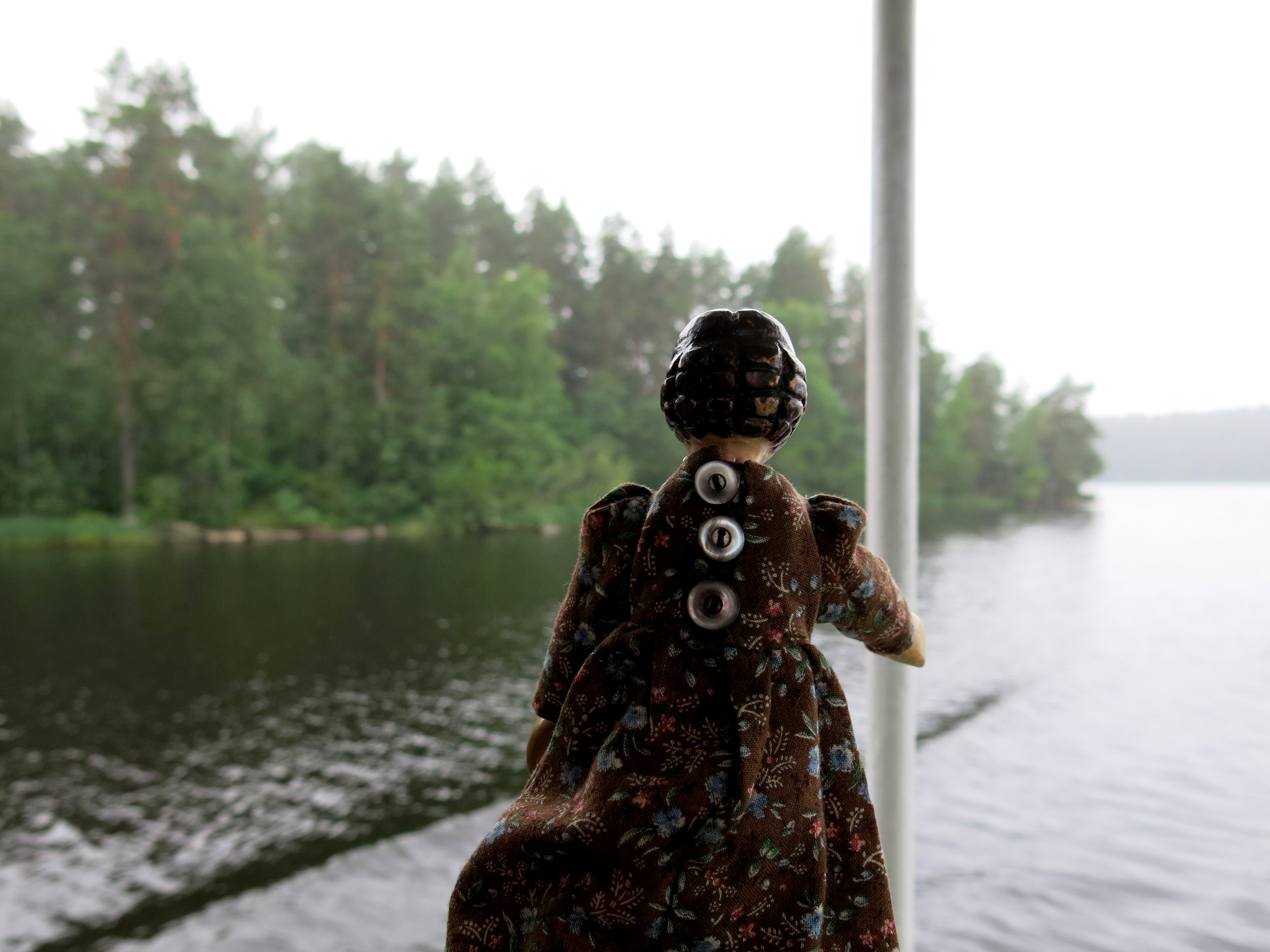 Feeling exceedingly privileged, we spent an afternoon at this cottage.  First the humans participated in a true Finnish sauna, which is located in the corner of the cottage. Women first, and men afterward. The stove in the sauna had been heating for three hours before we arrived! Constance declined, being anxious about what the steam and heat would do to her wooden joints. The humans found it an envigourating experience, including the dip in the lake afterward!  After the sauna we had a most wonderful dinner, including kalakukko, smoked muikku, fresh new potatoes, tomato salad and cucumber salad, and Constance’s favourite dessert…