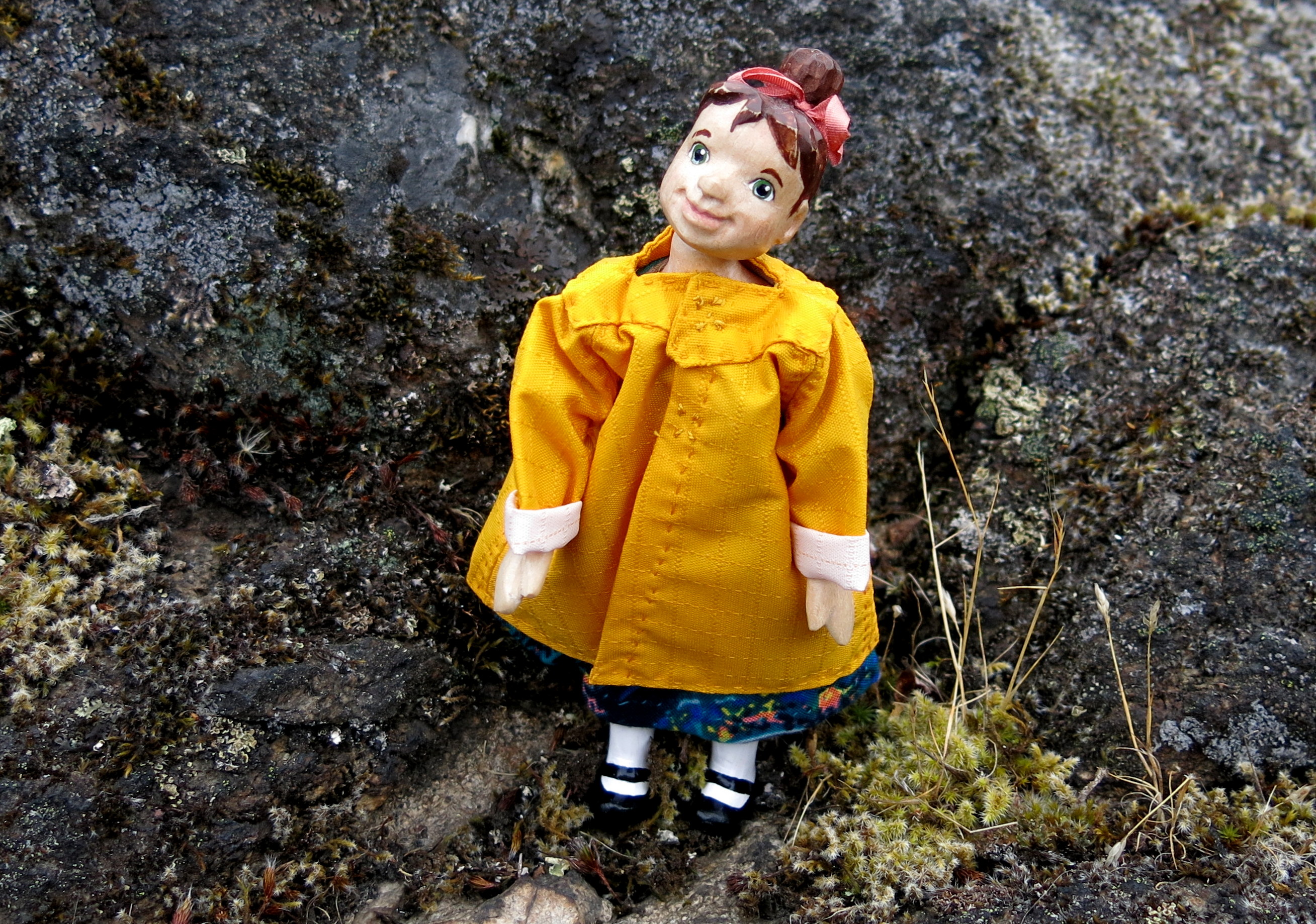 This is the first incarnation of a Hitty raincoat that I ever made. It didn’t fit at all but I couldn’t bear to get rid of it – little did I know that Min would come along and claim it! Min is always up to something, like trying on her sisters’ clothes, some of which fit her better than them!