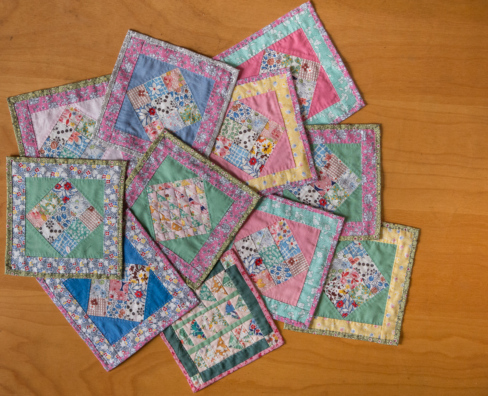 Constance and Min are at this very moment in Tennessee, having accompanied their human to a carving workshop. A new Hitty sister is destined to accompany them home, and these little quilts will stay behind as gifts for the fellow carvers.