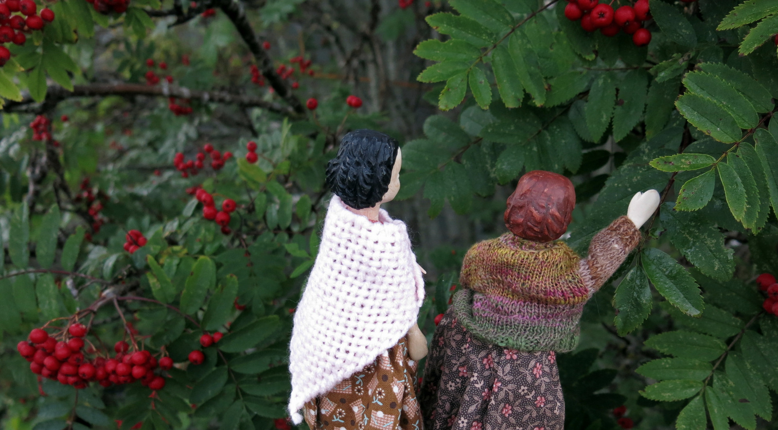 On an early autumn evening recently, Patience and Hattie put on their wraps and went for a stroll. First they found some Mountain Ash berries – which are special to Hittys because the Original Hitty was supposedly made from Mountain Ash wood…