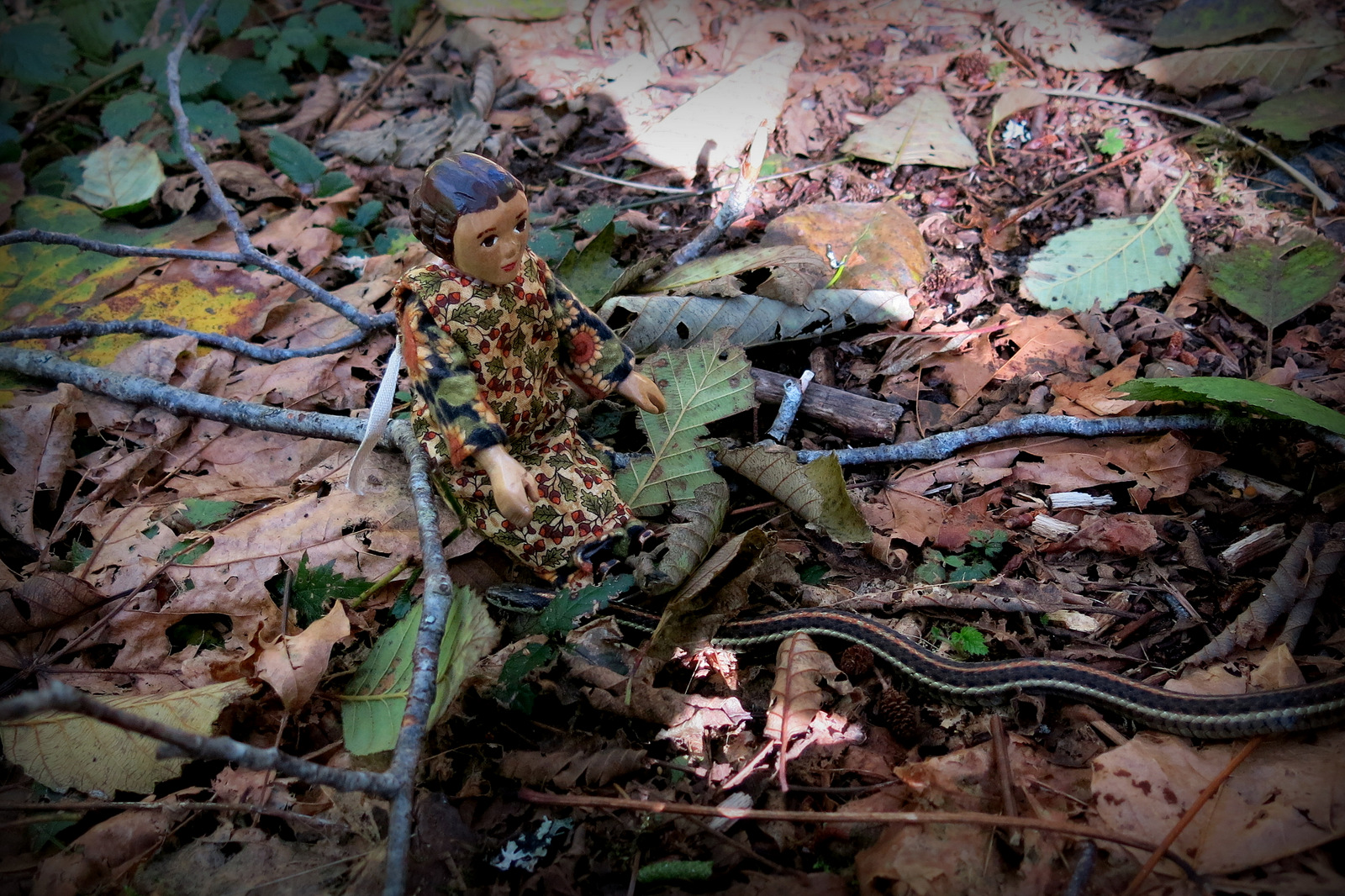 Constance preferred the view from the ground where she encountered a pretty garter snake trying to warm itself in a sunny patch of leaves.