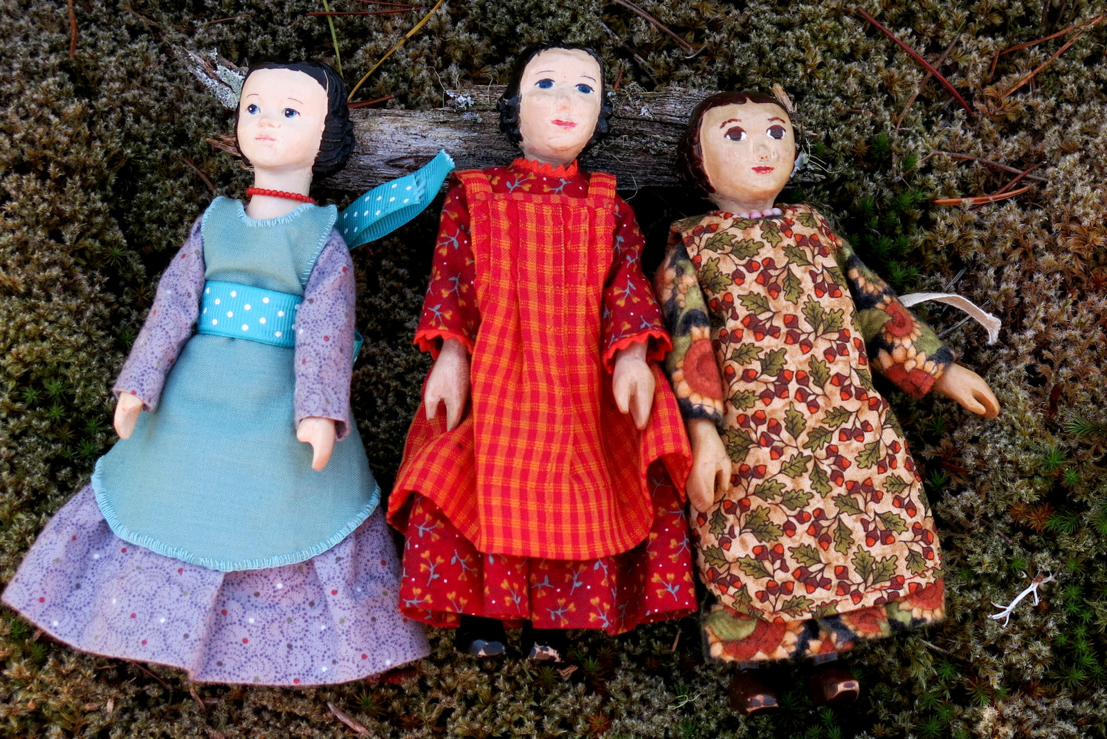 The wooden girls feel right at home  in the woods, and much of Read Island is forested. Here they are gazing at a damp gully from inside a tree throw.
