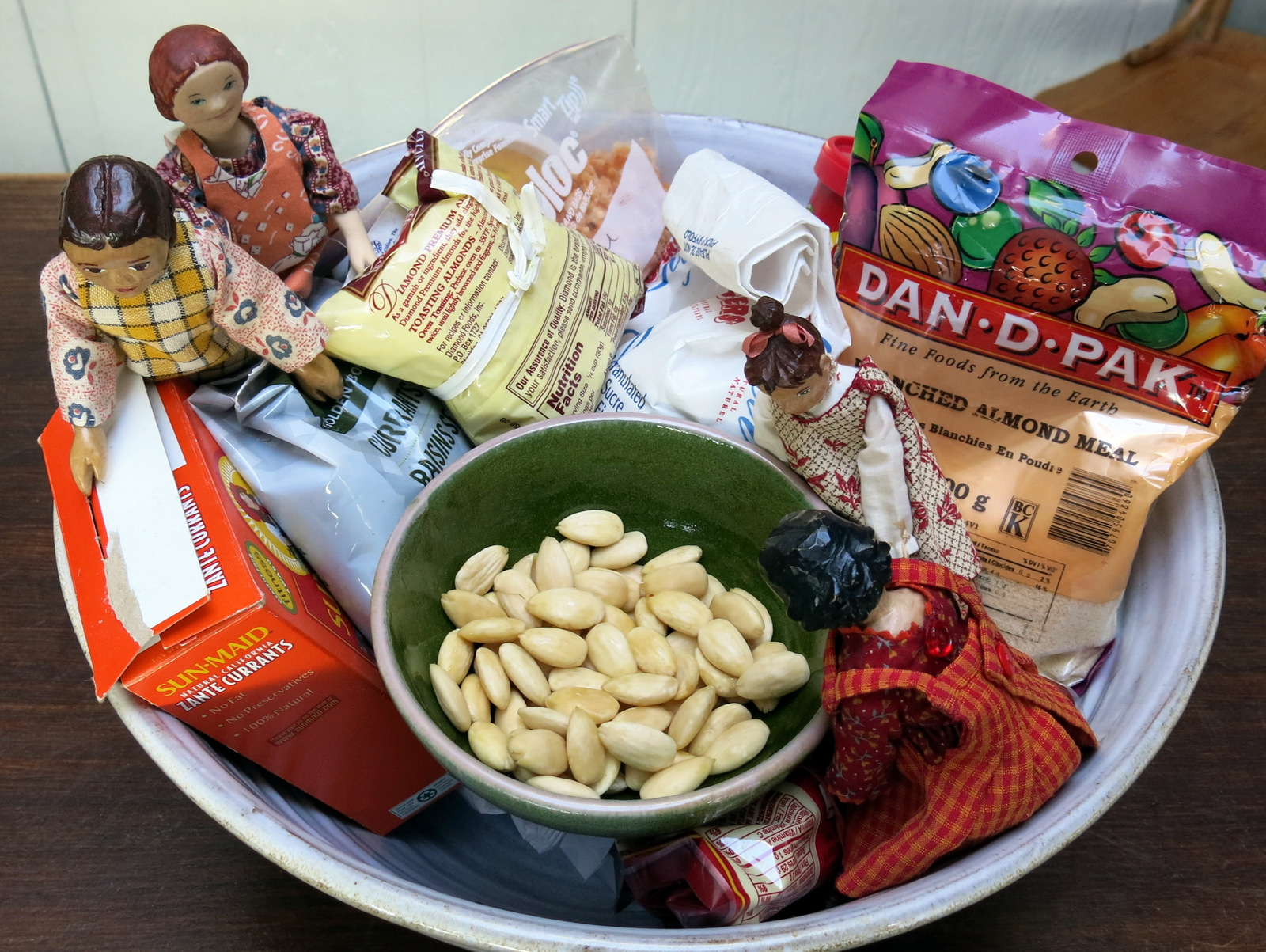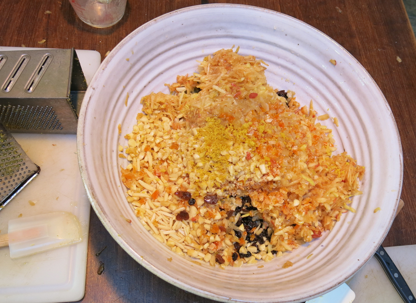 Many hands make light work – fortunately the humans and Hittys both had lots of help, and the big bowl was quickly filled up with raisins and almonds, grated apples and lemon zest and everything else.