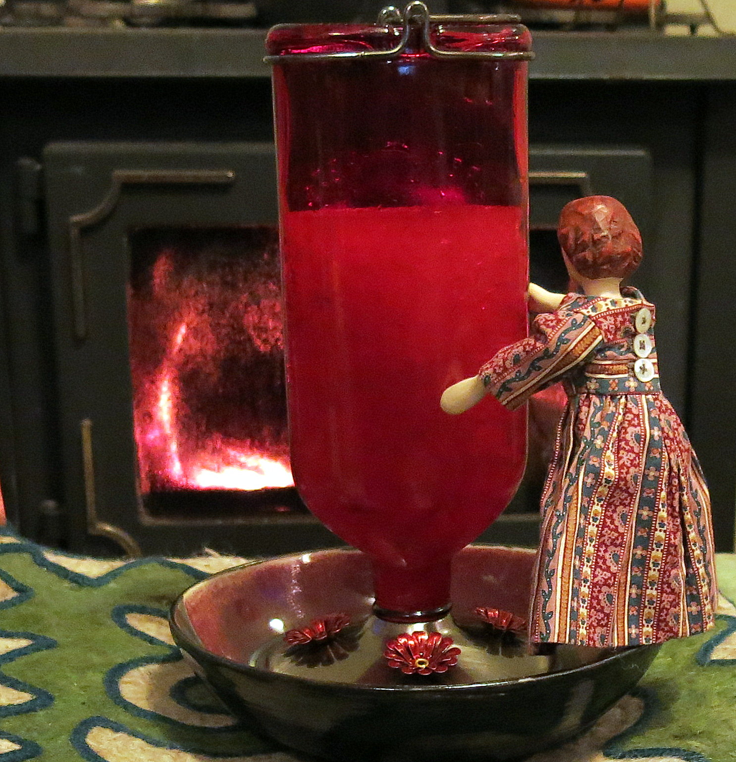 It was so cold in the night that the Hummingbird’s nectar froze solid inside the feeder…Hattie thought we should bring it indoors to thaw near the woodstove…