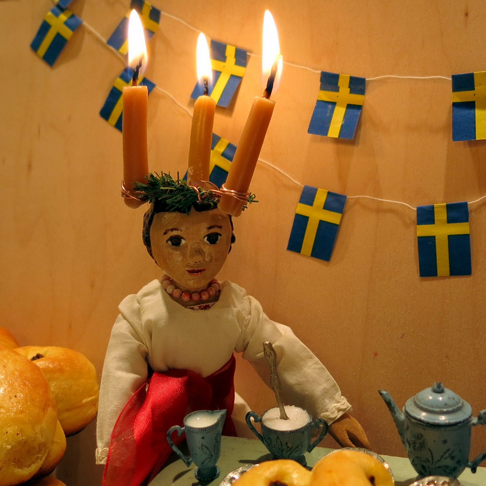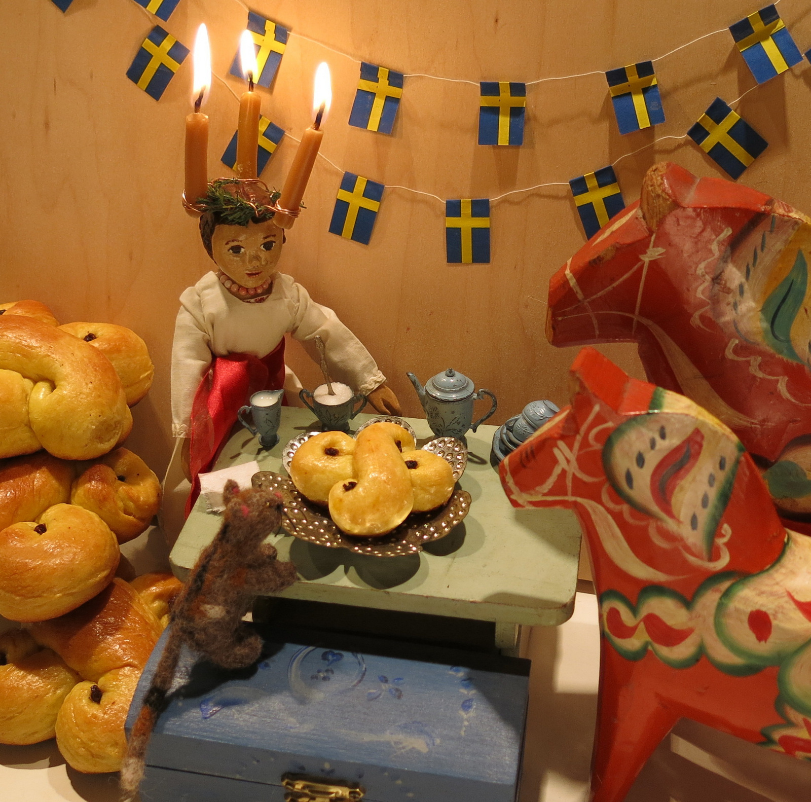 Constance is ready to serve and eat the delicious Lussekatter, and turns on her scratchy old recording of Sankta Lucia.