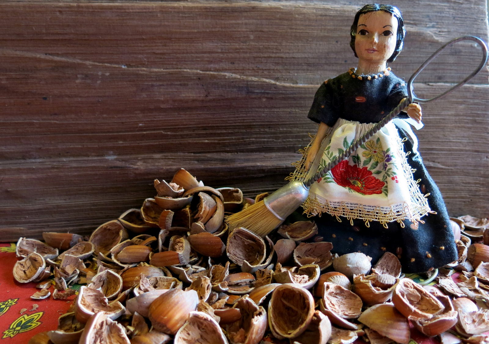 Nut-extracting generates a lot of mess. Fortunately, Gracia has her apron on and enjoys sweeping!