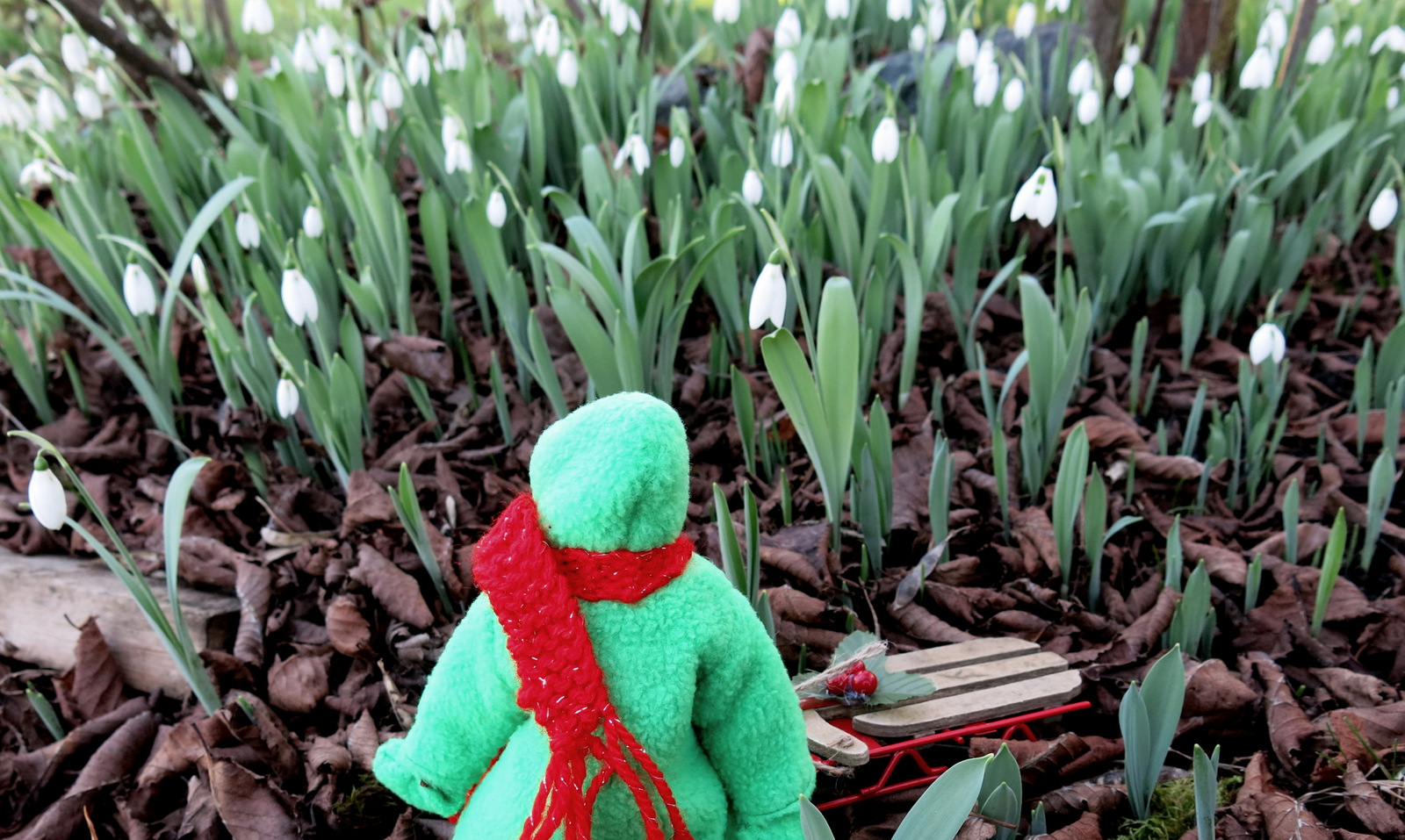 Oh dear poor Tansy, she was so well wrapped up for the snow drift and what did she find but beautiful snowdrops instead…although she seems to have missed the beauty of them in her disappointment of no snow. We have a couple of new sleds that Miles and Brittany are hoping to try out….although secretly I am hoping that we only get the snow drop kind of ‘snow’ as well.