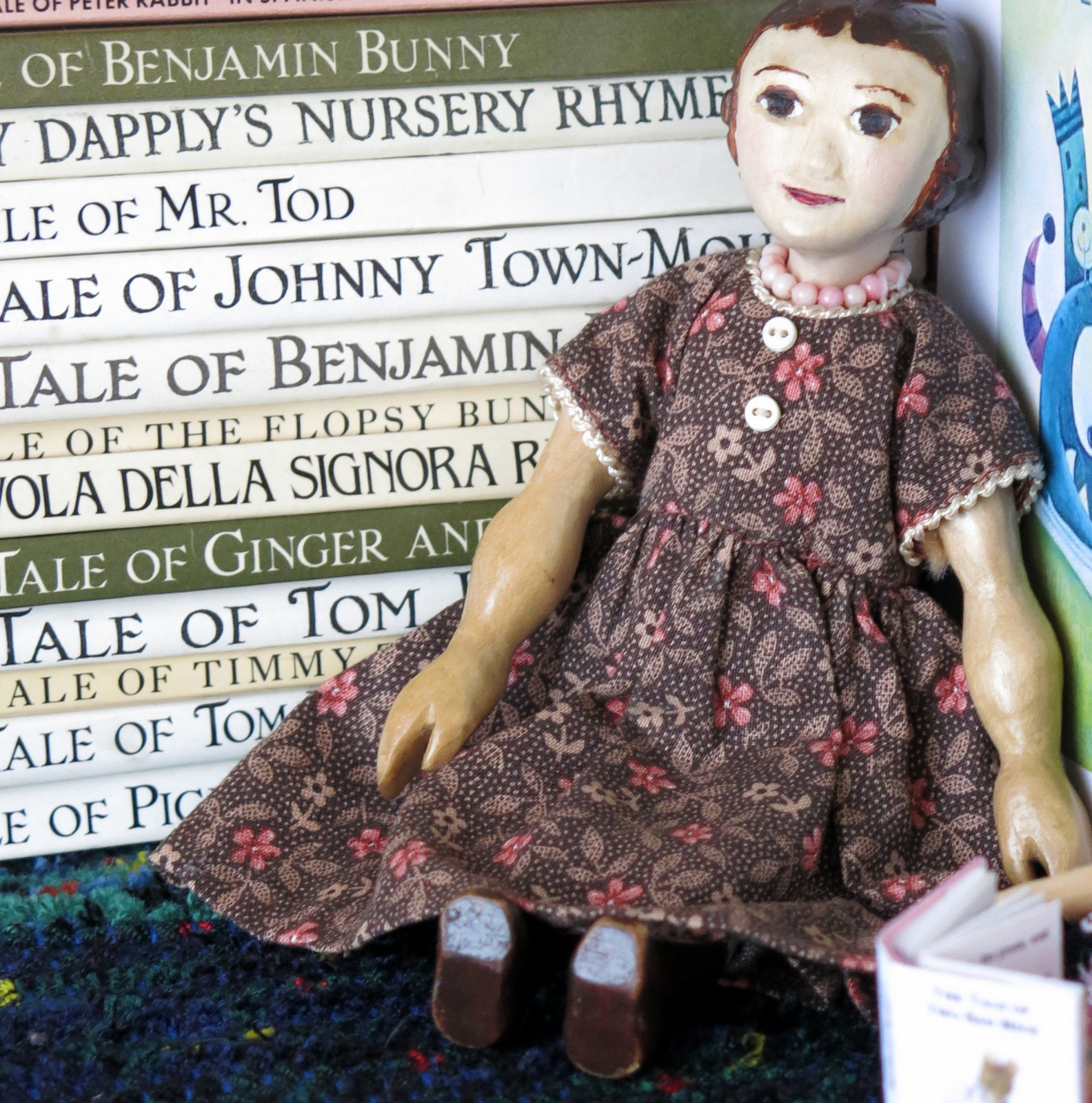 Thanks for the reminder! Hitty Lucy is rushing to the bookshop to find something for H. Gisella who is convalescing again. She wants to know which of the Tiggywinkles or Tittlemouses is the subject of the Favola della Signora..? Lucy thinks Constance’s dress is delightfully bookish somehow, but she is not quite sure why! H. Lucy has an arrangement with the bookseller, that if she dusts the entire very well stocked bookshop, she may choose a small book as wages.