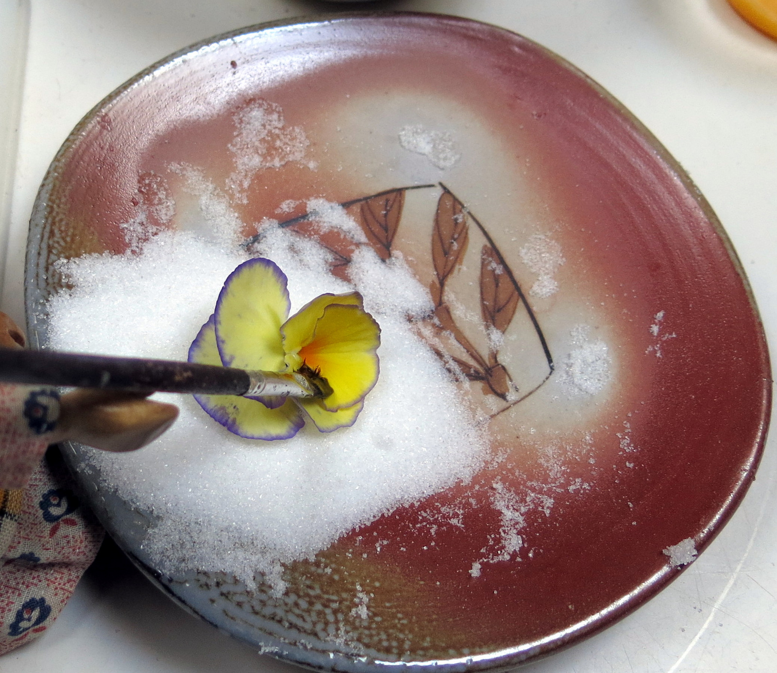 Both sides of the flower are dredged in sugar, and the pansies left to desiccate overnight.