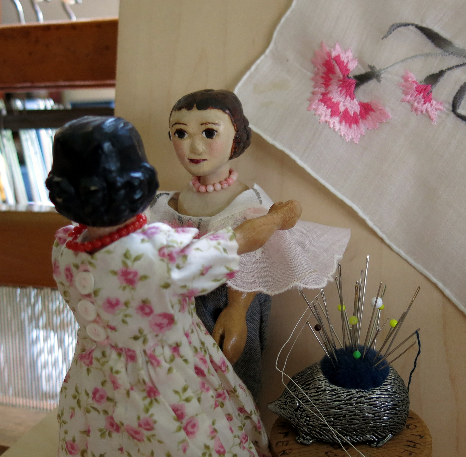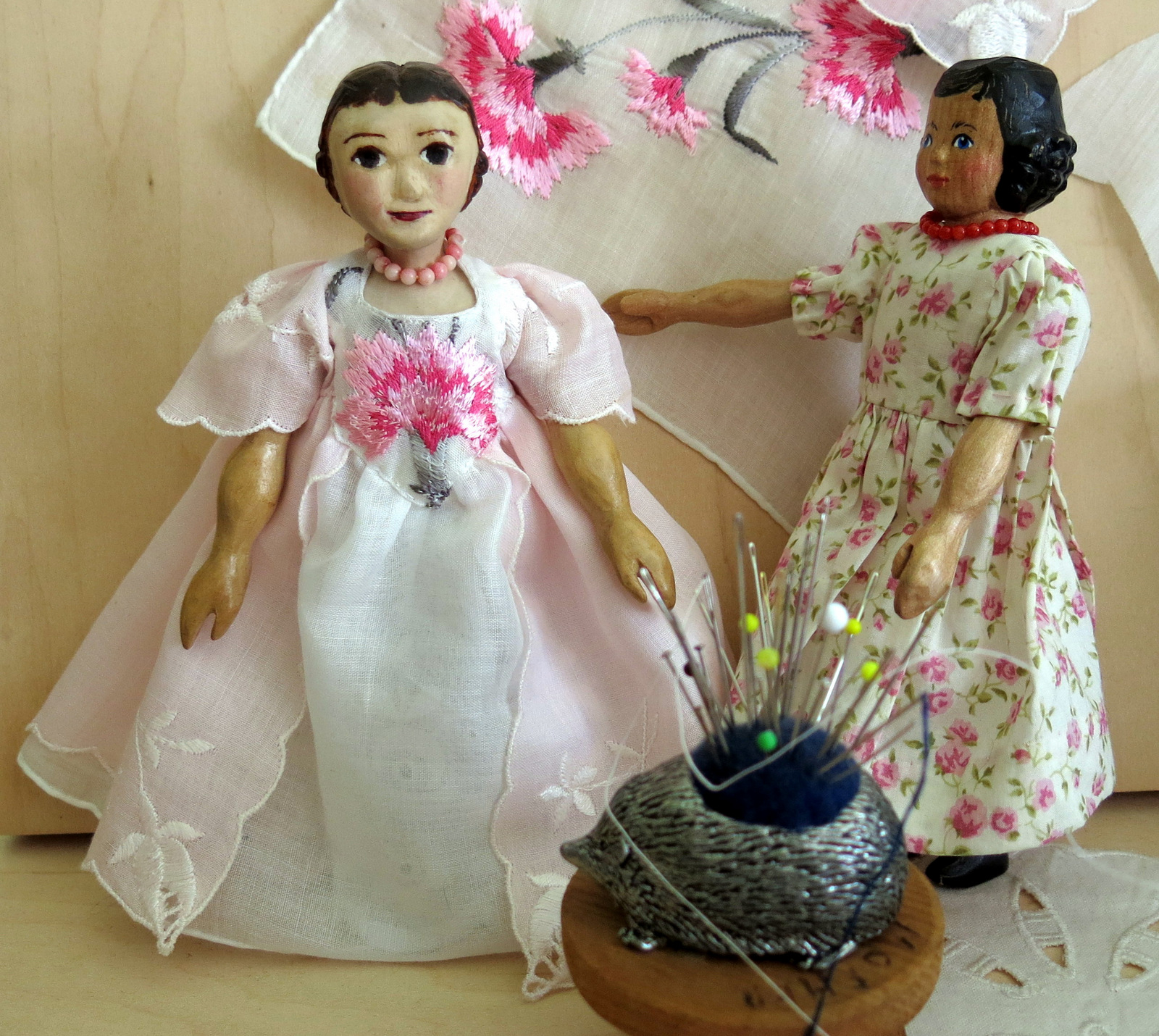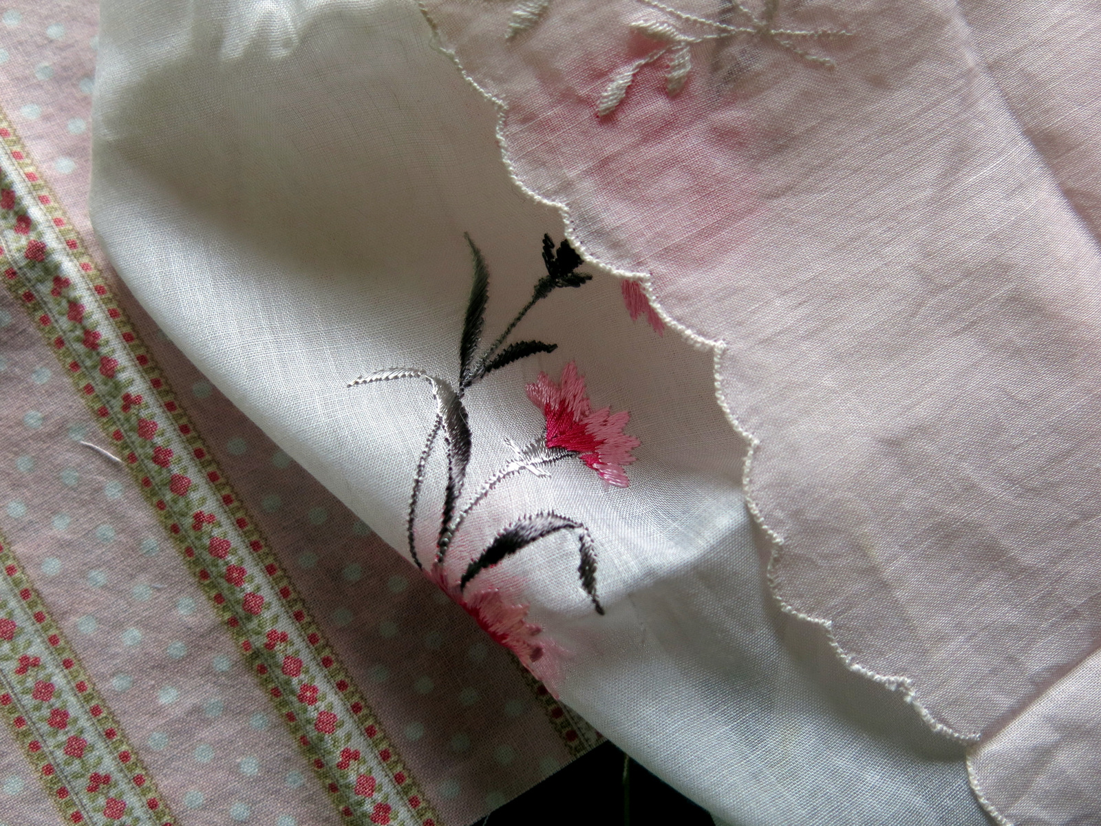 The Quimper Hitty human went on a sewing jag this morning, with the intention of making a new Hitty gown out of two items from the Box of Treasure…a Swiss cotton Hanky with machine-embroidered pink carnations, and a pretty pale pink linen Hanky with scalloped edging.