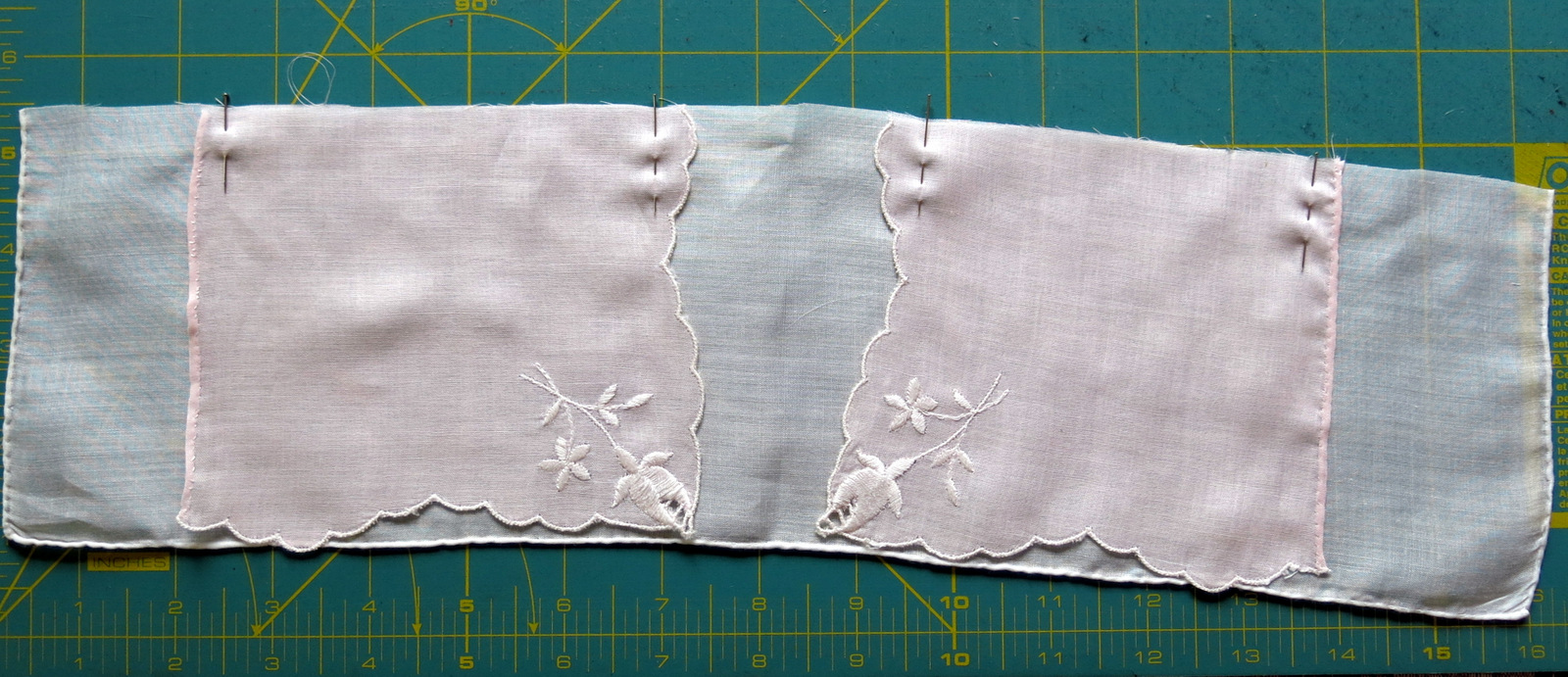 The sleeves are cut out of the corners of the pink linen Hanky.