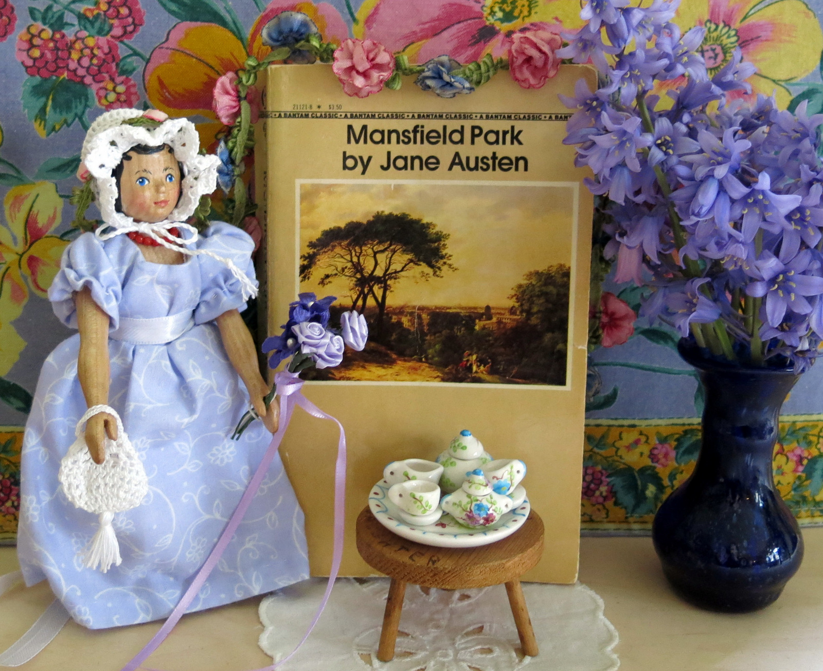 Two Hundred Years ago today (or possibly some time in in July) Jane Austen’s Mansfield Park was published…It was definitely some time in 1814, but the dates are unclear to me! Wikipedia says both on the same page, so obviously need to dig deeper. In any case, Rose is pleased to have an excuse to wear one of the Quimper Hittys’ Regency Outfits. Her dress was made by one Hitty friend, and the pretty crochet bonnet, and matching reticule by another.