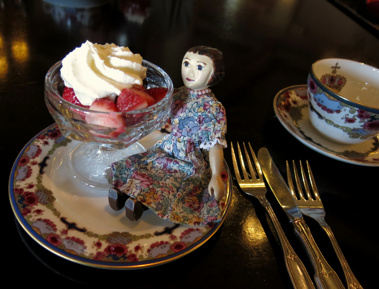 Elegant tables set with Linen Napkins, multiple pieces of cutlery, and bone china…. Constance knows that any meal that begins with a dish of Strawberries and cream is going to be a good meal!