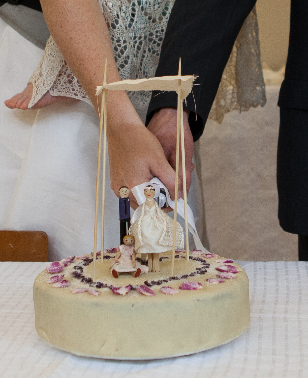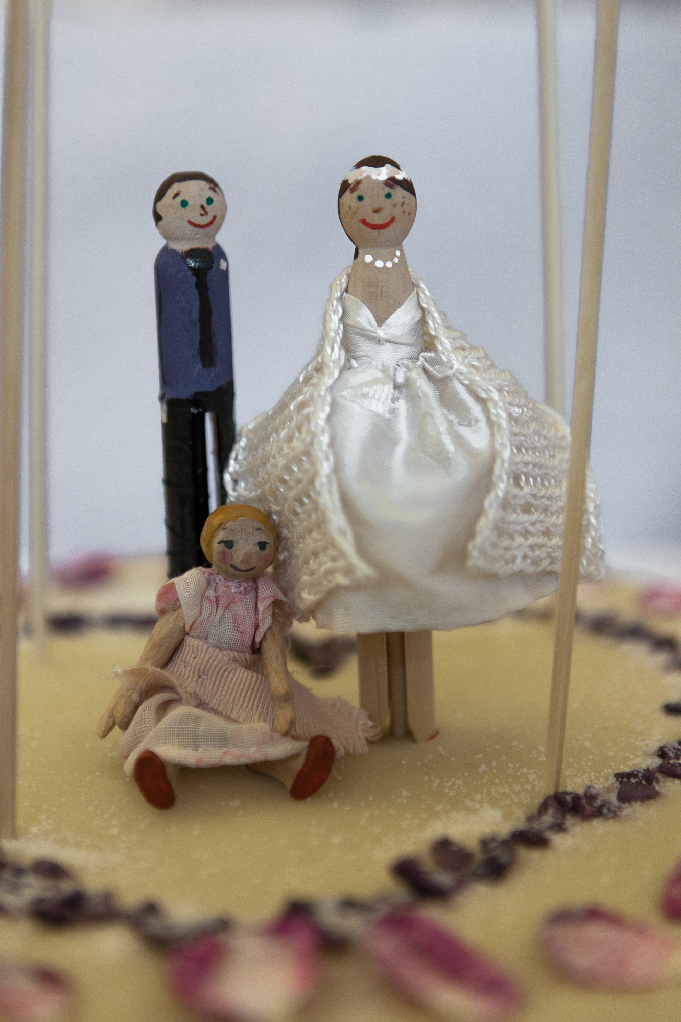 The traditional English Fruitcake was collaborative effort of the bride, her mother and her grandmother. The Marchpane coating was decorated with sugared rose petals from the garden, and candied violets from France. The dolls were made by the bride and her mother.